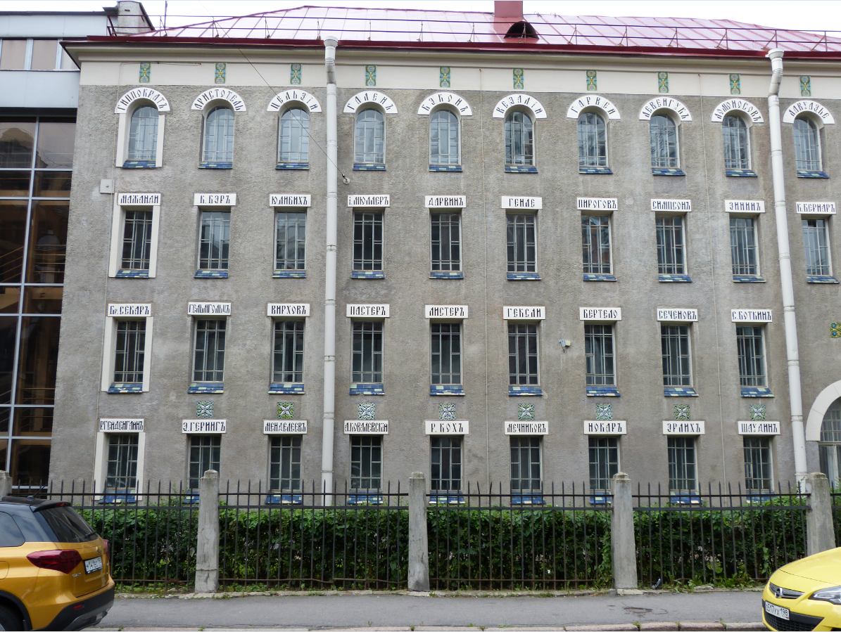 На фасаде книгохранилища, обращённом на северо-восток, видны майоликовые таблички с именами знаменитых ученых, прославившихся в области естествознания и медицины.