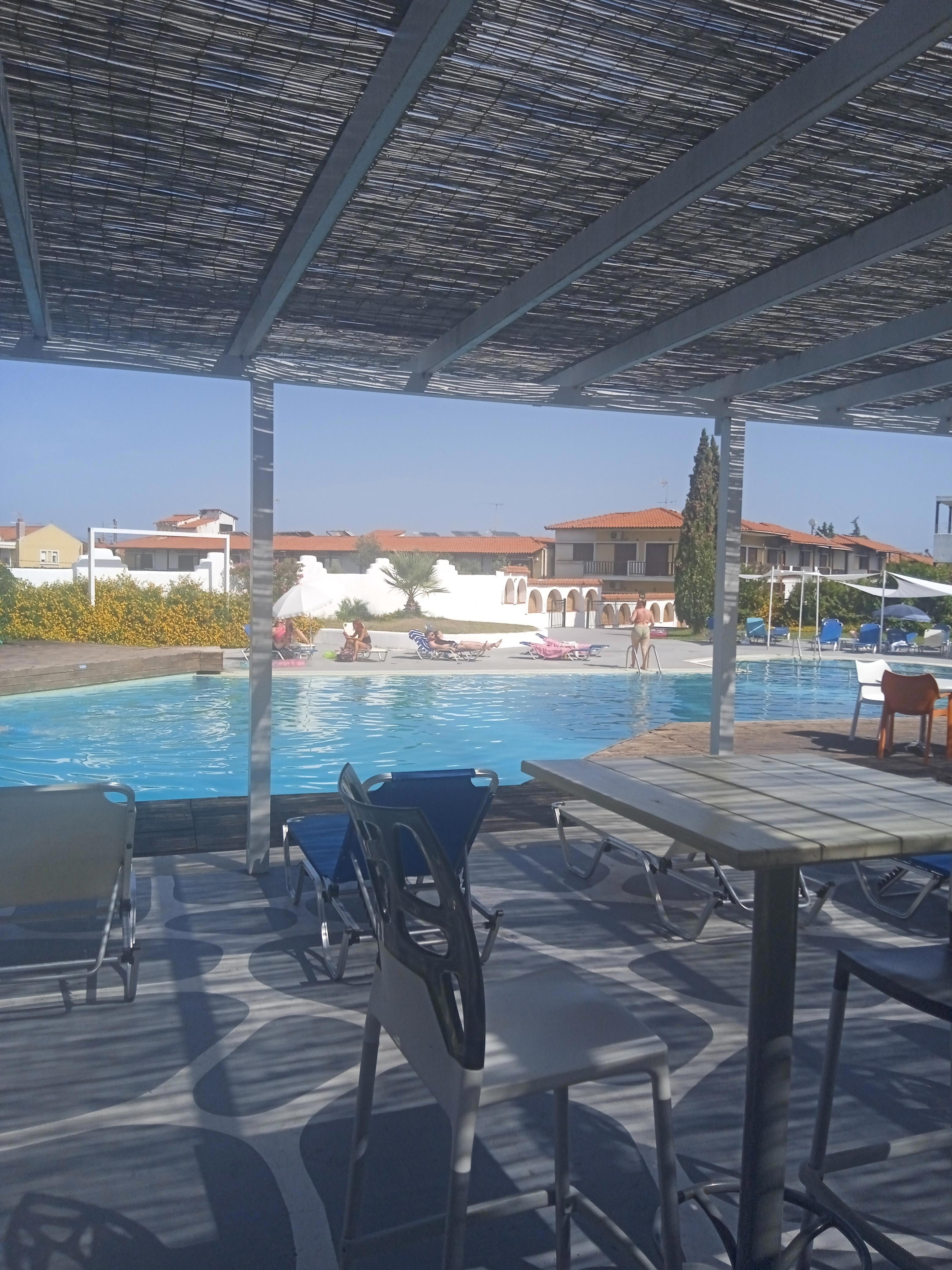 Здесь есть бассейн, таверна , где можно позавтракать и поужинать, бар, где мировой мужик, Костас, приготовит потрясающие коктейли и поднимет настроение своими шутками. И моречко не далеко. всего пару минут до пляжа.