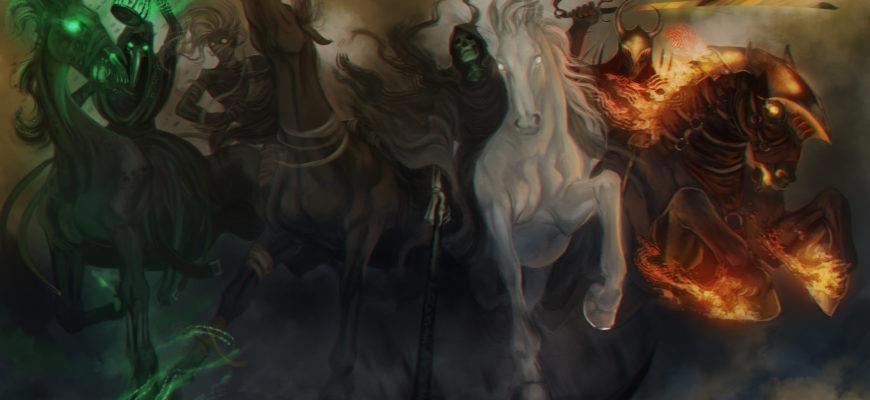 Последним, четвёртым всадником Апокалипсиса, будет сидящий на бледной (серо-зелёной) лошади. Этого всадника называют смертью. Иоанн сообщает в Откровении, что он поднял глаза и увидел лошадь бледно-зелёного цвета. На ней сидел всадник – Смерть
