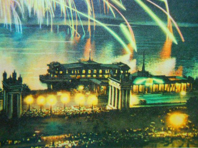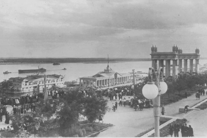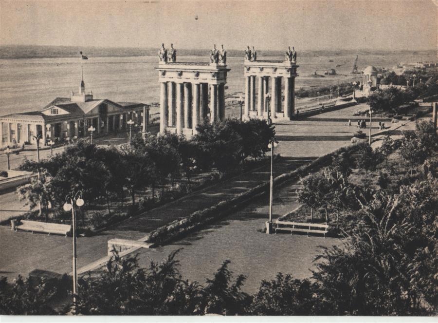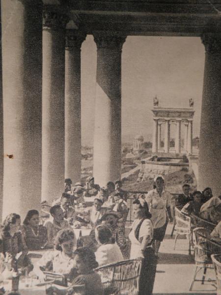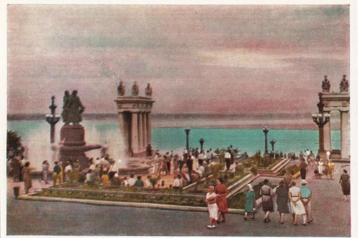 1954 год, на месте фонтана пока ещё самая обычная клумба - он появится лишь через три года, нет ещё и фонарей на лестнице: