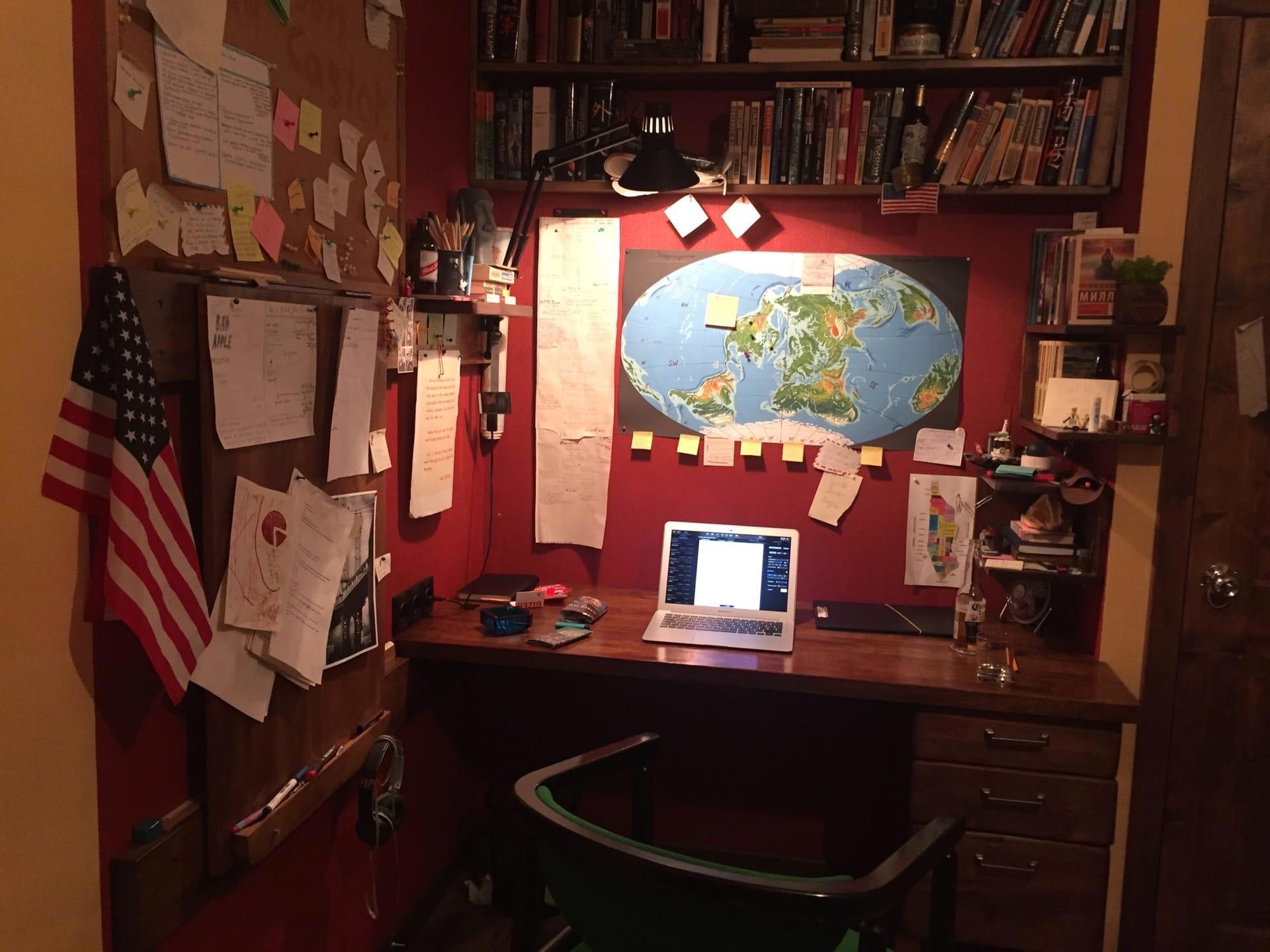 Стены можно оформить в похожем ключе, как на втором слайде (бардовый, как символ нрава хозяина кабинета, и в тот же миг пастельный, как знак скорой отходчивости).