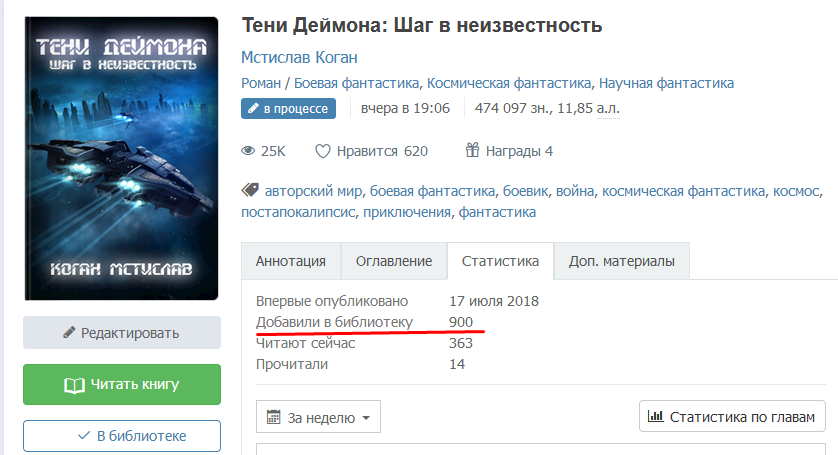 Автор: Коган Мстислав КонстантиновичИзначально (когда книга начинала выкладываться), я ставил своей целью набрать до ее конца хотя-бы 500 библиотек. Учитывая тот размер, который изначально для нее предполагался (12 АЛок) это было довольно сложной задачей, но, как ни странно, несмотря на достаточно непопулярный жанр: «научная фантастика» и отсутствие ЛитРПГ, попаданства и японщины – с этой задачей мне удалось справиться уже к 8му авторскому листу.