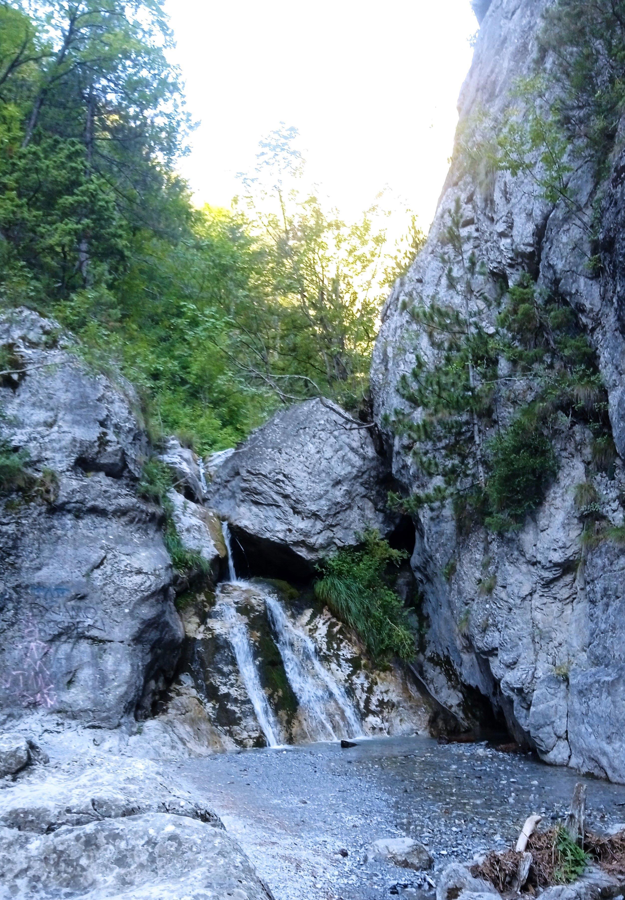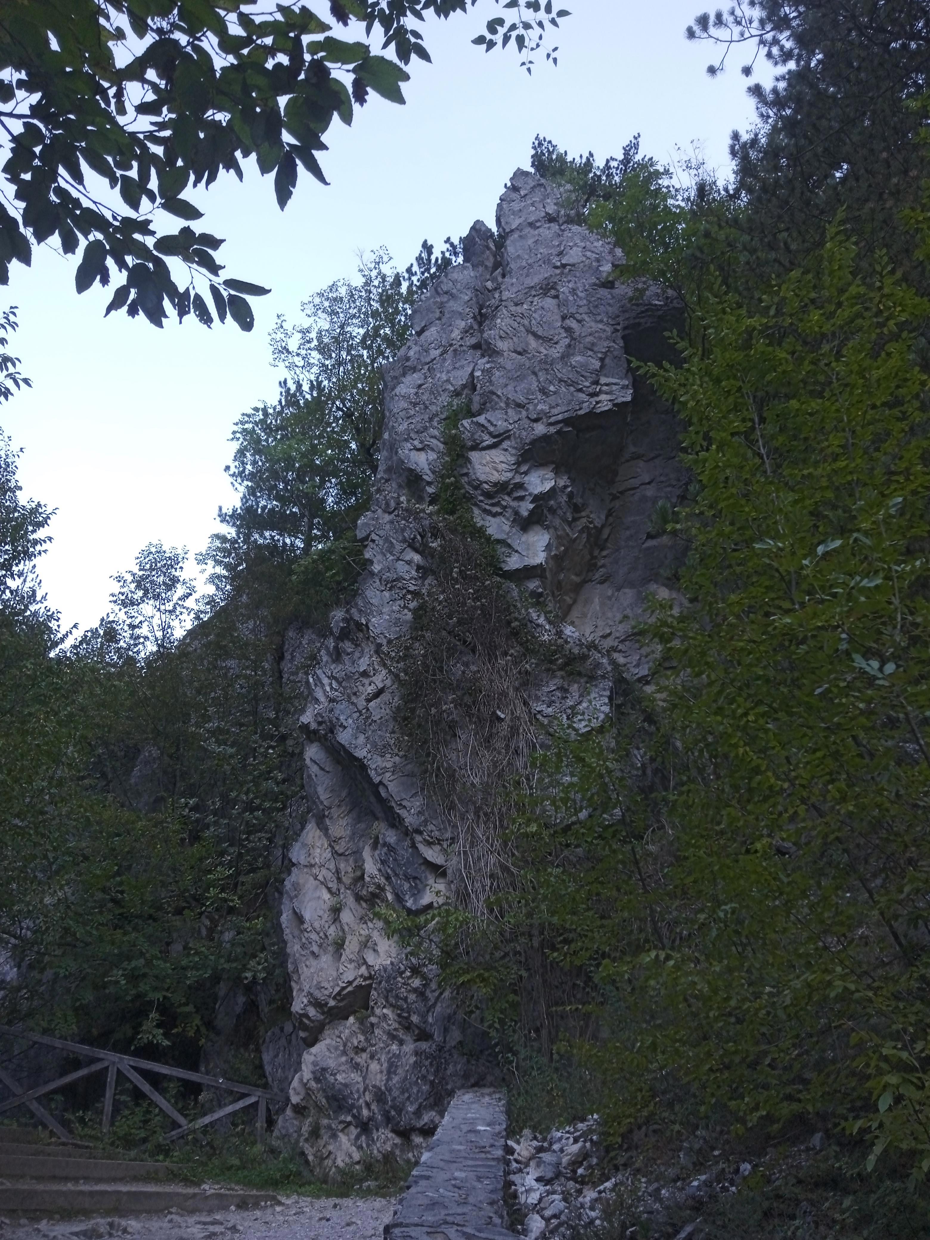 Изначально нужно быстро пробежать по мостику рядом со скалой (табличка предупреждает, что камушки падают на медленные головушки), затем заглянуть на водопад ( что-то он оскудел за семь лет).