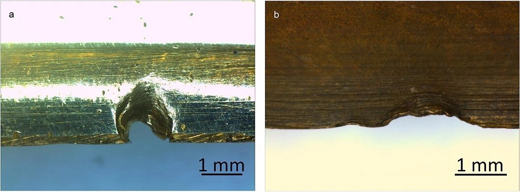 Кроме того, на плоскостях клинков 4 аутентичных мечей были выявлены косые полосы, которые могли быть получены из-за парирования лезвия клинка противника плоскостью клинка. Прием выполнялся для предохранения лезвия клинка от повреждения. Был проведен дополнительный эксперимент, который подтвердил, что данное повреждение могло быть получено при таком парировании.