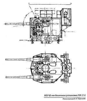 1937 год : 1 × 2 — 102-мм/45БАУ (башенная артиллерийская установка) МК-2-4; 2 × БАУ40-К: 1 × 45-мм, 1 × 7,62-мм.