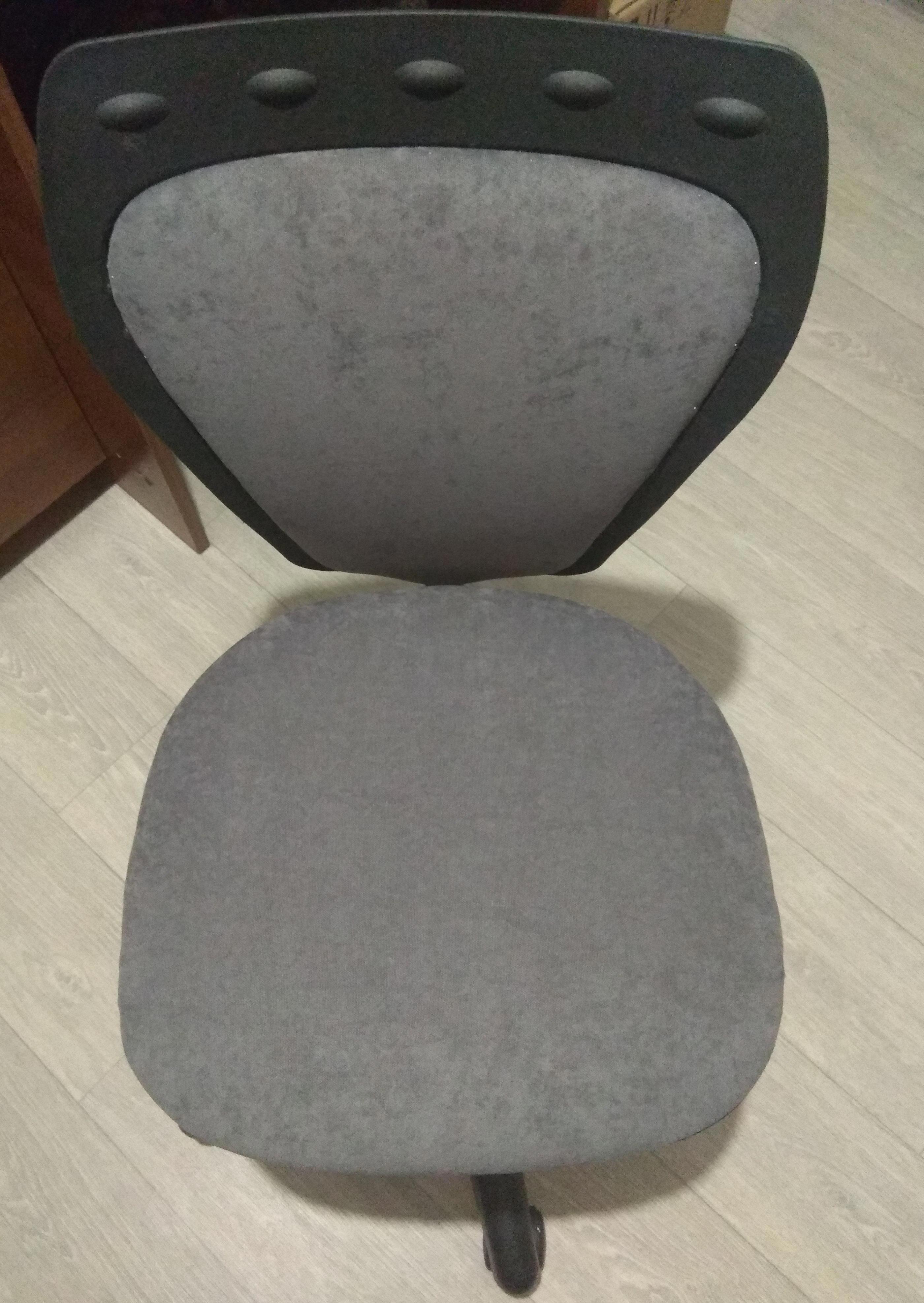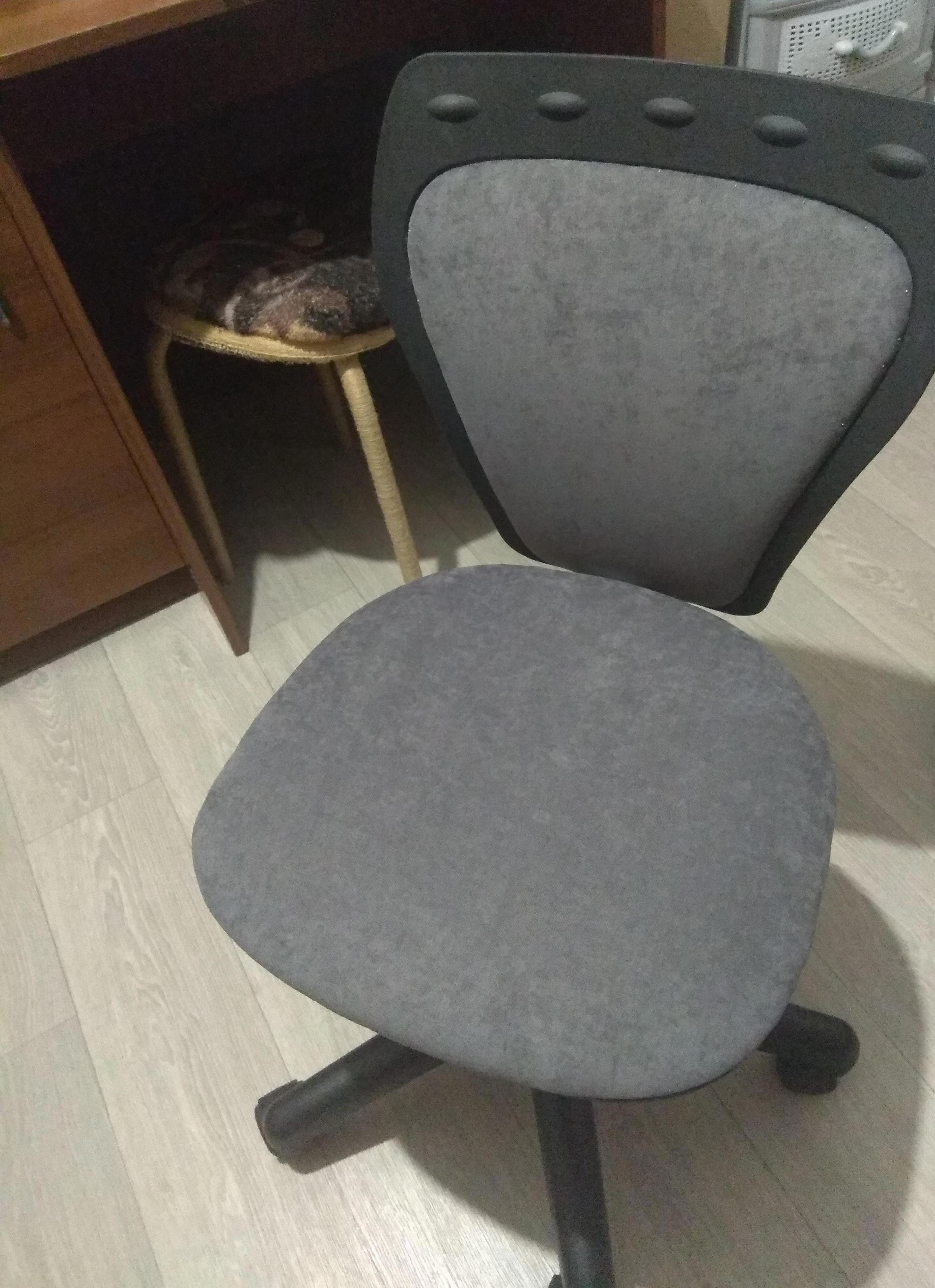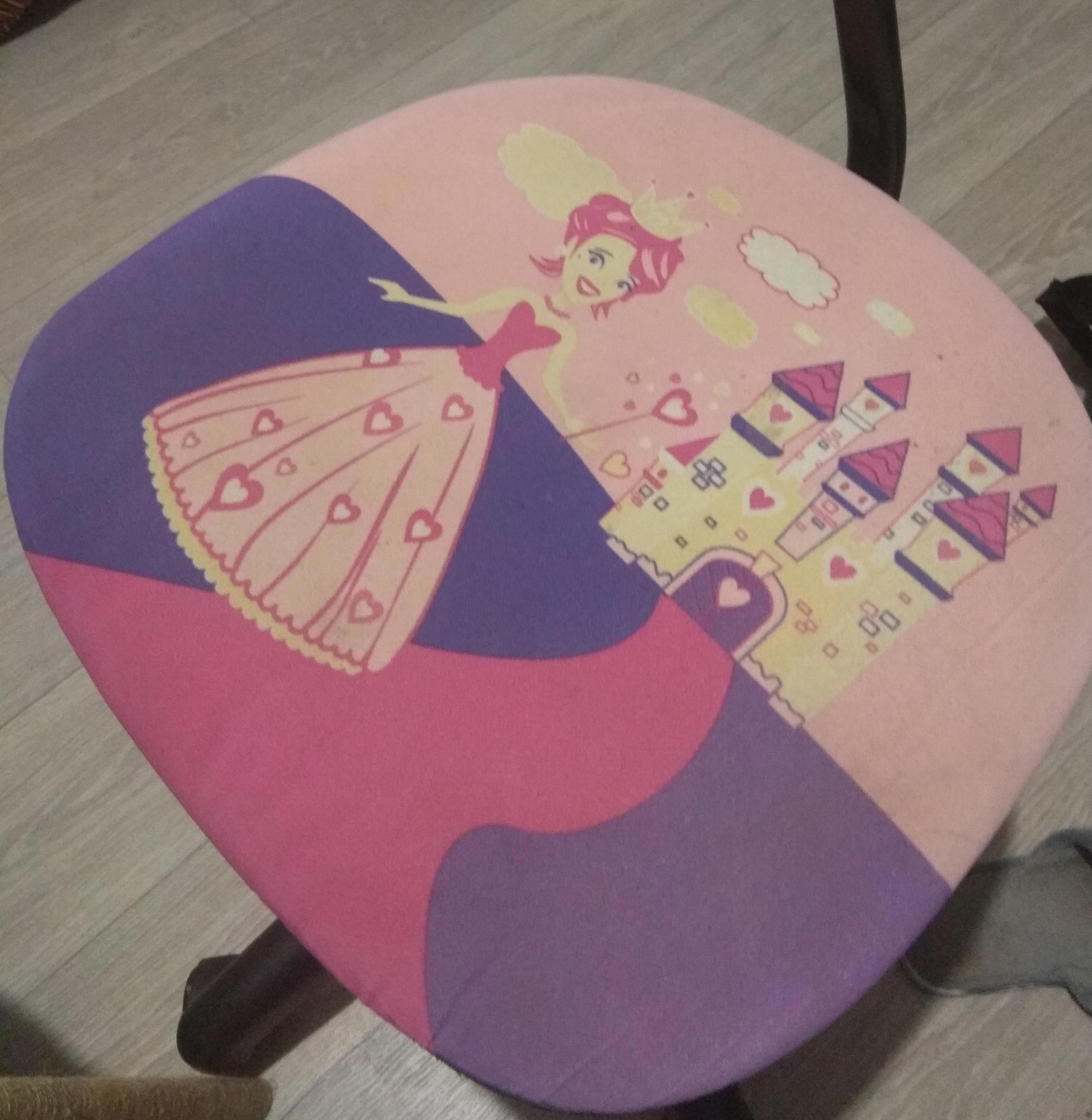 Дочкин еще, с принцессами. И очень надоел. А поскольку у меня все в серо-черно-белых тонах, (стол мечтаю в будущем заменить, а табуретку обтянуть таким же материалом), серый стул очень вписывается теперь в интерьер.
