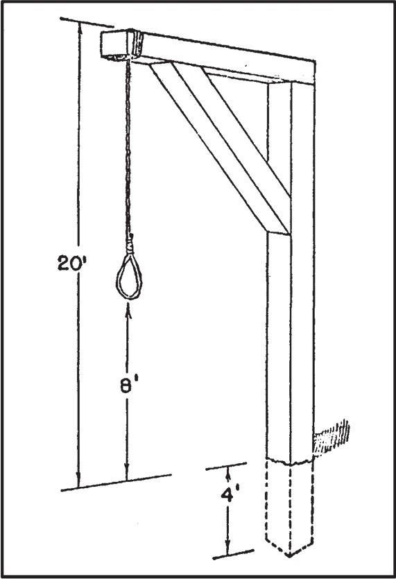 Дополнительными необходимыми предметами были черный капюшон, "разрезанный на открытом конце так, чтобы он хорошо прилегал к груди и спине заключенного". Пришлось прикрепить шнурок, "чтобы капюшон плотно прилегал к шее". Должна была быть предусмотрена откидная доска на случай, если заключенный не сможет сам поддерживать себя и его придется повесить привязанным к доске. Ремни были необходимы для того, чтобы привязать руки заключенного к боку и зафиксировать его ноги. Веревка, завязанная в узел палача, должна была быть "из манильской пеньки, диаметром 1 дюйм и длиной примерно 20 футов". Она должна была быть "растянута, чтобы устранить любую скрутку", и обработана воском, мылом или жиром, "чтобы обеспечить плавное скольжение через узел".