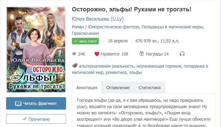 Автор: Арина Родина"Осторожно, эльфы!" это первый (пока единственный, но все впереди) роман, который я прочитала у Юлии Васильевой.
