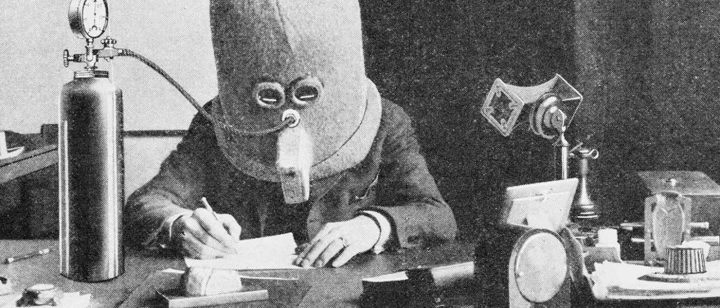 Знаете, что это у мистера Гернсбека на голове? Его крутое изобретение: изолятор для писателей. По сути ведро надевается на голову, через отверстие подключается баллон с кислородом и, в результате, писателя ничто не отвлекает от работы. Пожалуй, если ты можешь сделать такую штуку удержаться невозможно! Полное погружение в работу гарантировано. Мне вот тоже хочется, порой, закрыться в бункере, чтобы ничто и никто не мешал писать... Хотя, по нынешним временам, достаточно отключить телефон и не выходить в интернет дальше википедии.