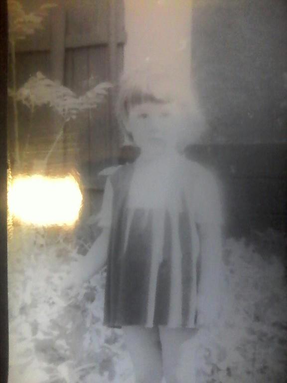 Здесь мне четыре года. У меня радость -- вернулся из армии мой любимый дядя! Это он меня, кстати, и запечатлел. Первые фото получались у него экспериментальными, потому качество не очень. Помню, как я просилась посмотреть "волшебство", когда он делал фотографии. И потом мы сидели в ванной, зашторив единственное оконце, и наблюдали, как в растворе проявлялись лица и силуэты.