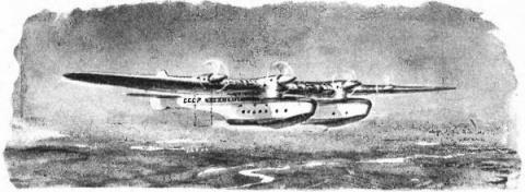 К самолету быстро идет катер. Он берет самолет на буксир. Скоро гигантская машина была пришвартована у специальной пристани около здания аэровокзала. Сотни людей встречают воздушный экспресс, как встречают на вокзалах железнодорожные поезда. Репортеры газет стремятся получить интервью у Киреева и у других членов экипажа.