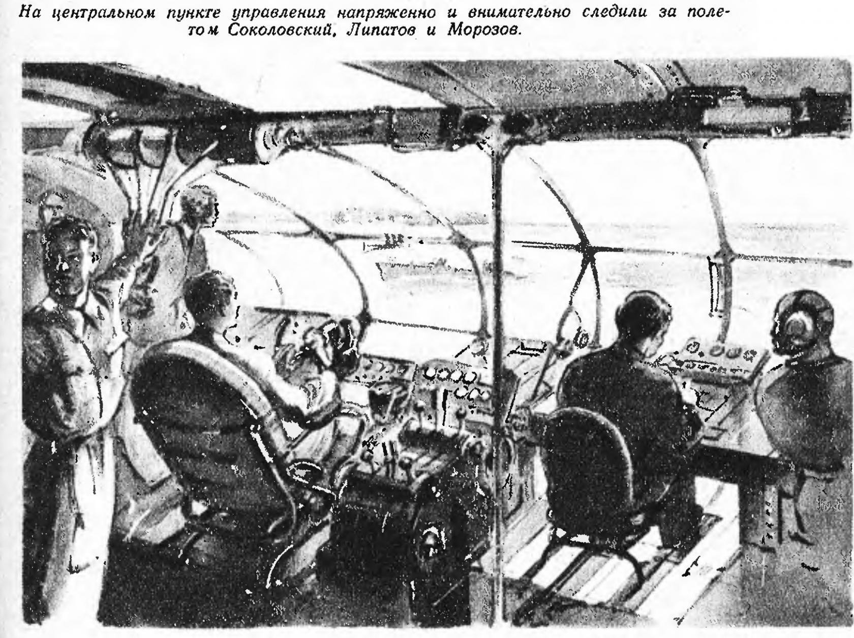 Между тем в помещении пульта управления самолетом уже собралось вое командование во главе с Киреевым. Здесь были и прибывшие в последний момент Андрей Петрович Родченко, первый пилот Соколовский, штурман Липатов, механик Морозов и главный инженер Вяткин. Стрелка часов приближалась к цифре шесть.