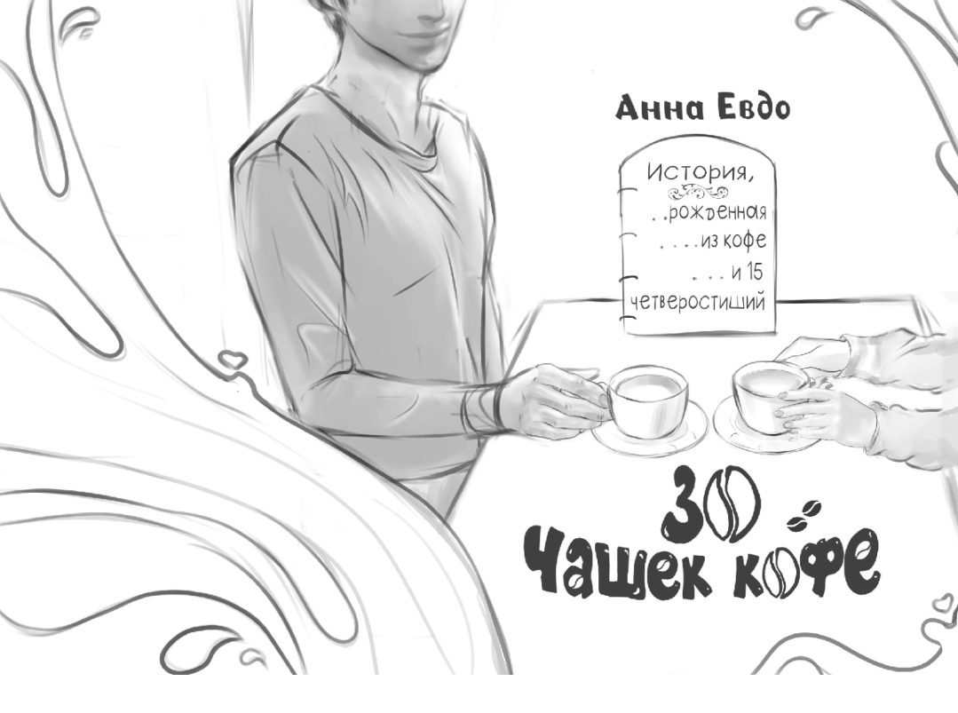 Здесь была отрисовка леттеринга под тему книги. Вокруг потоки кофе, а позади героя яркий, но теплый солнечный свет. На столе также разлито кофе (название), сам стол текстурный, из дерева.