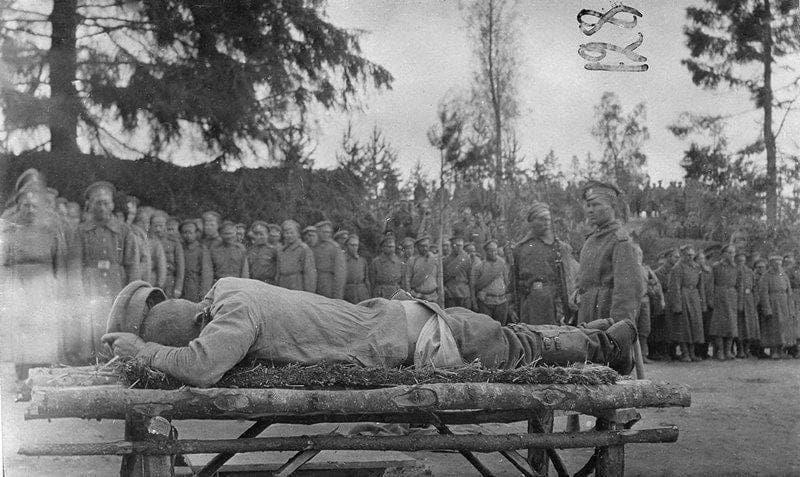 Однако в 1915 году, в ходе Первой мировой войны, телесные наказания восстановили в армии как вид дисциплинарного воздействия. Это явилось следствием Горлицкого прорыва немецкой и австрийской армий и Великого отступления российской армии летом и осенью 1915 года. Насчёт того, кто именно инициировал данное решение, я не смог найти однозначной информации. Пишут, что в 1915 году выходило распоряжение Верховного главнокомандующего по поводу введения в частях Действующей армии телесных наказаний за нарушение дисциплины.