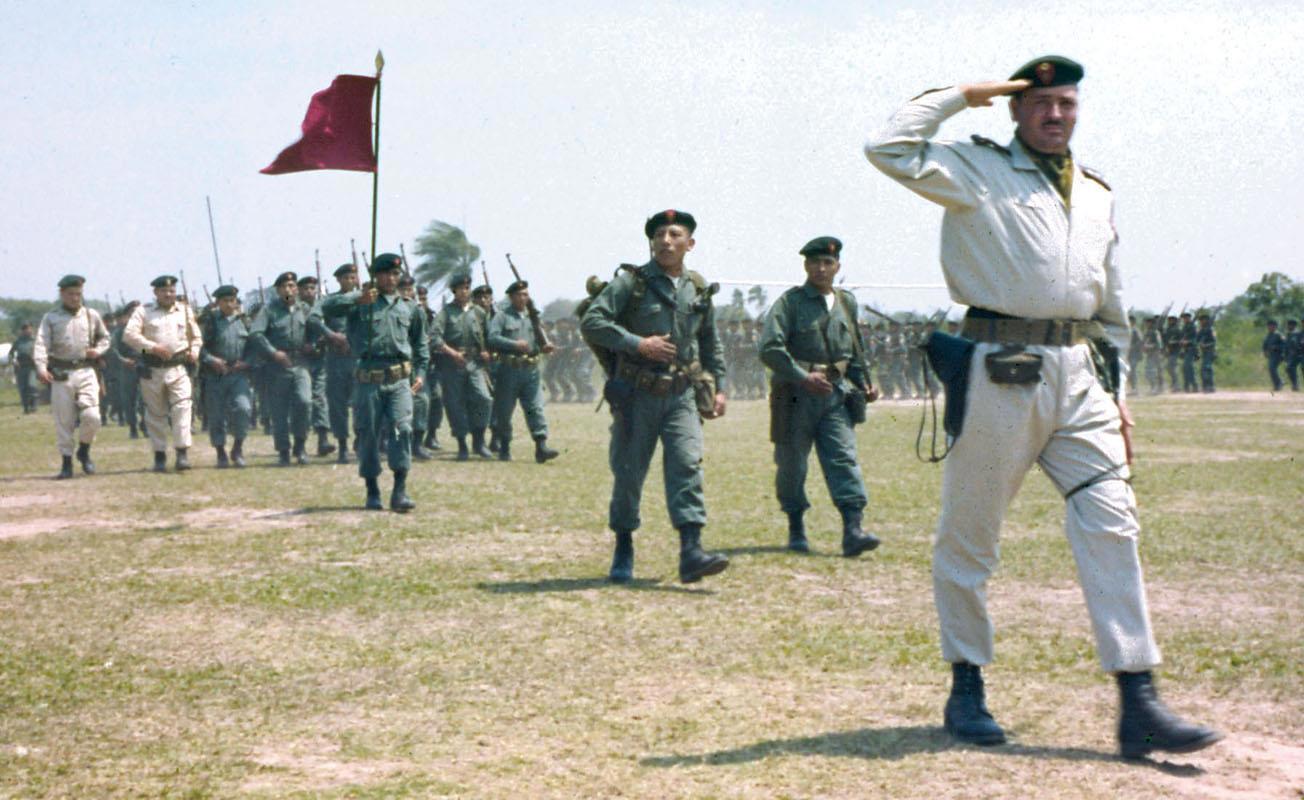 Американские инструктора готовятся к прыжкам вместе с курсантами воздушно-десантной школы в Кочабамбе, октябрь 1967 года. На заднем плане — F-51D Mustang времен Корейской войны, основной истребитель боливийских ВВС на то время.
