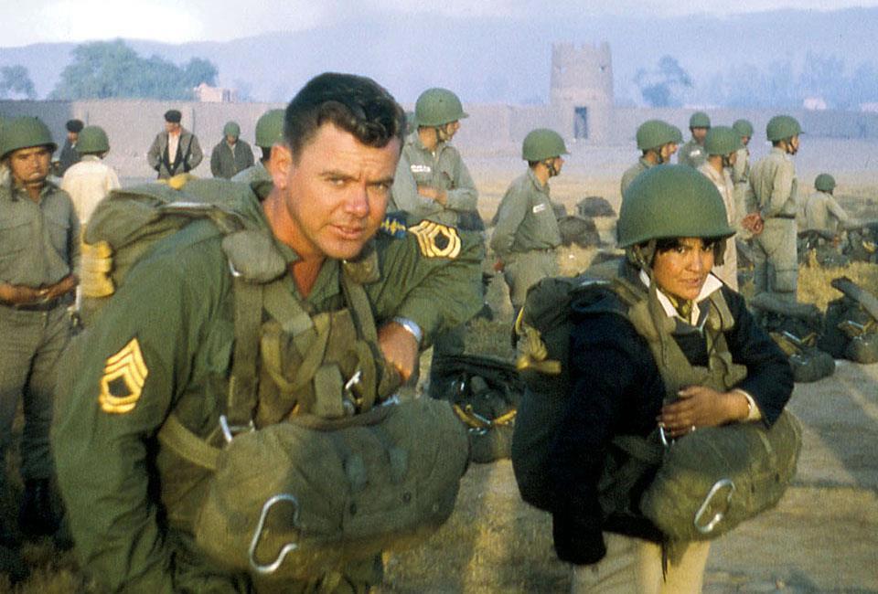 Кстати, боливийцы юзали забавную систему мотивации к прыжкам: в состав группы включали женщин-парашютисток. В патриархальной католической стране сдрейфить и не прыгнуть, после того, как прыгнула женщина, попросту невозможно)) На фото - американский сержант-инструктор и боливийская парашютистка.