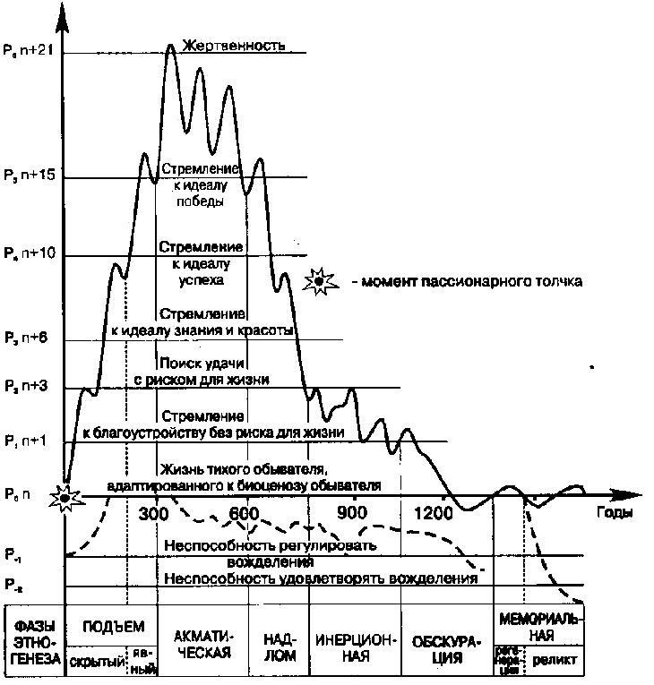 График, изображающий зависимость пассионарности этнической системы от времени её существования согласно Пассионарной теории этногенеза Льва Гумилева
