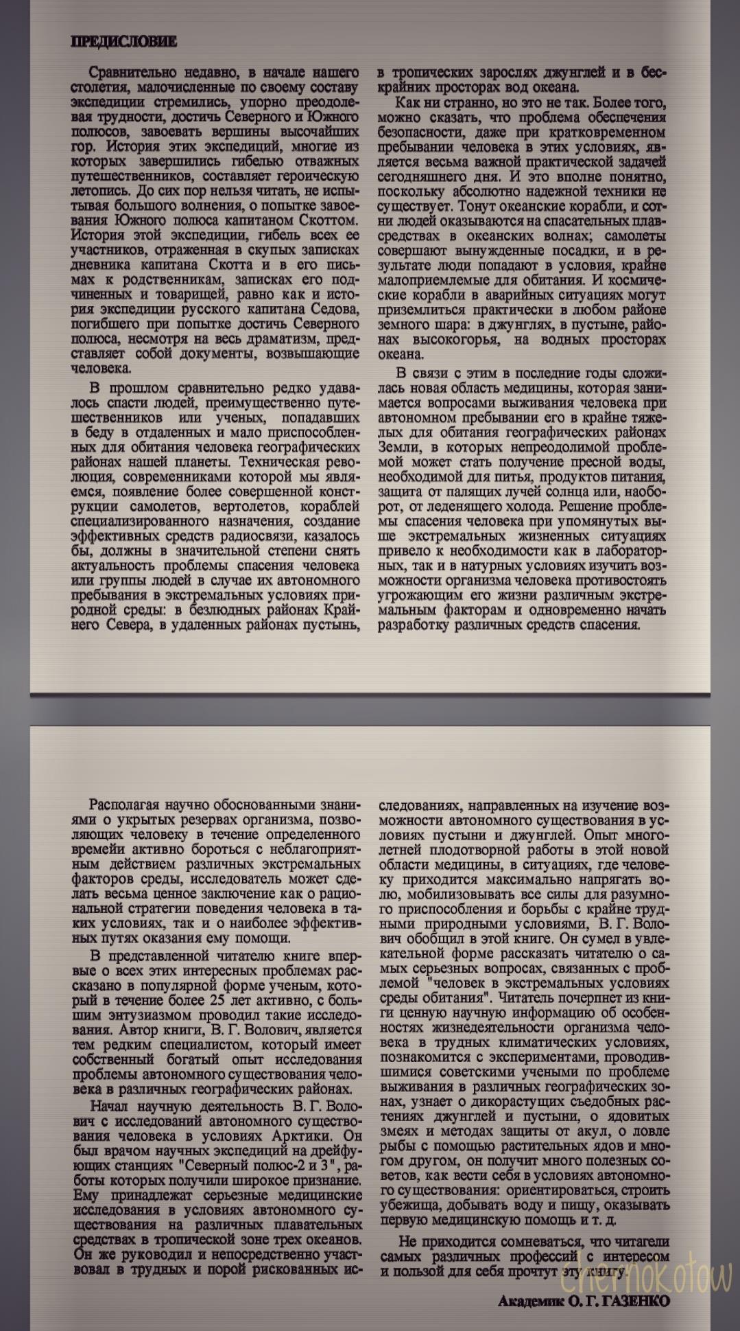 Несмотря на древность и некое количество информации сомнительной полезности, определённое представление о реальном "выживаче" книга всё - таки даёт, что ясно уже из предисловия. И да - выживание это, по сути, один из разделов экстремальной медицины. Разумеется, дополненный рядом навыков из туризма, альпинизма, охотничьего дела, прикладной топографии и т.п. Но в основе - физиология и медицина. Сюрприз, не правда ли? Стоит ли говорить, что это всё не имеет ничего общего с чудачествами Беара не нашего всё Грилса и ему подобных? И - очень жаль, что в наше время исследования на подобную тематику чуть ли не сошли на "нет". Потому что пока человек, например, не извёл вокруг себя природу, переместившись в виртуальную среду , знания о том, как выкручиваться из всяких внештатных ситуаций, застигнувших врасплох вдали от цивилизации, не потеряют своей актуальности.