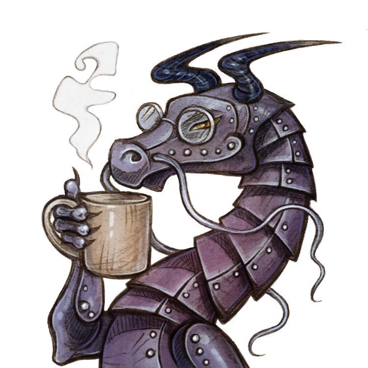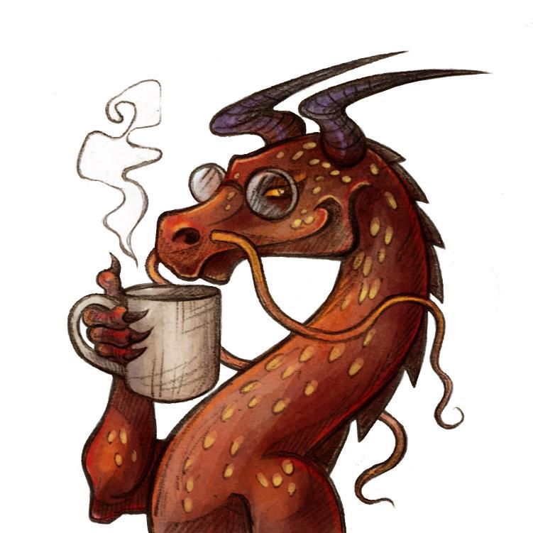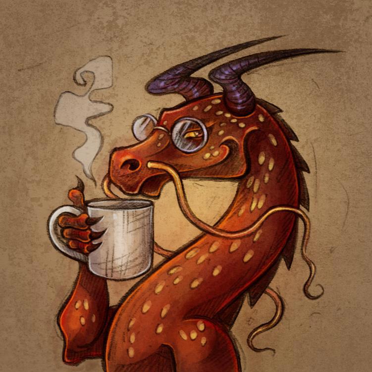 До третьего иллюстратора удалось наконец донести свои пожелания. Дракончик получился забавным и не грозным, как мне и хотелось. Кстати, родился я в год дракона, зрение у меня плохое, чай люблю, так что новый вариант отражает меня лучше. Да и мое творчество не настолько серьезно и пафосно, как прошлые варианты.