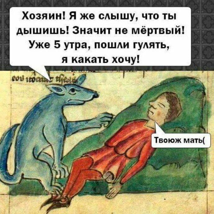 Опытный собаковладелец умеет просыпаться не открывая глаз, не шелохнувшись, не сбивая дыхания с ритма. Семьи собаковладельцев способны превращаться в лежащие статуи всем составом, включая глубоких стариков и новорожденных младенцев. Семь утра: гробовая тишина, глубокое дыханье и ритмичный стук хвоста по полу. Но стоит хоть кому-нибудь проколоться и едва заметно шевельнуть хотя бы ноздрёй, сразу: