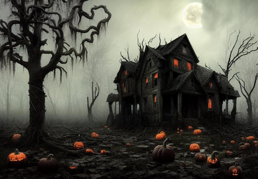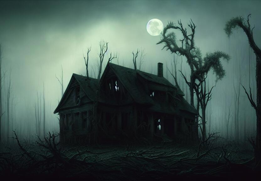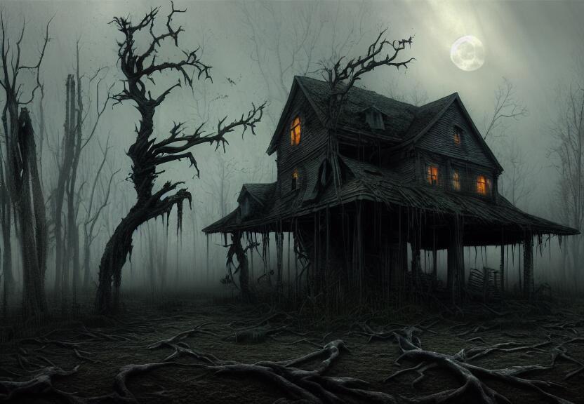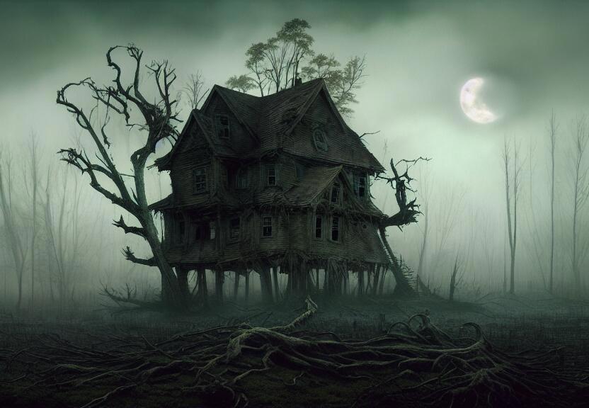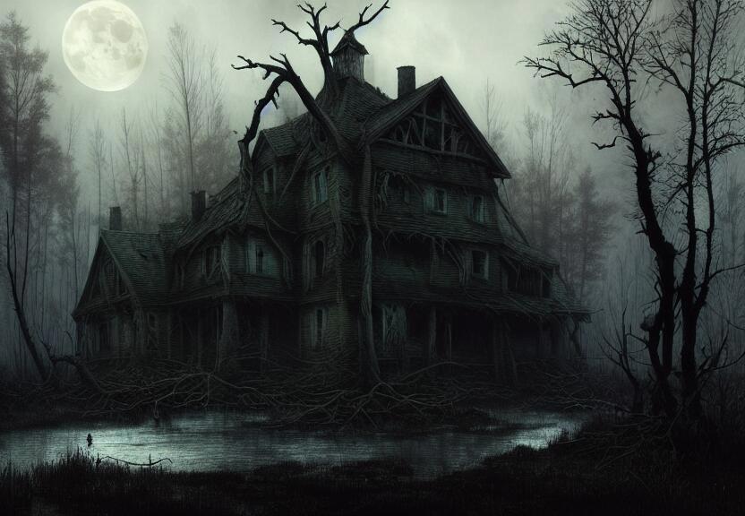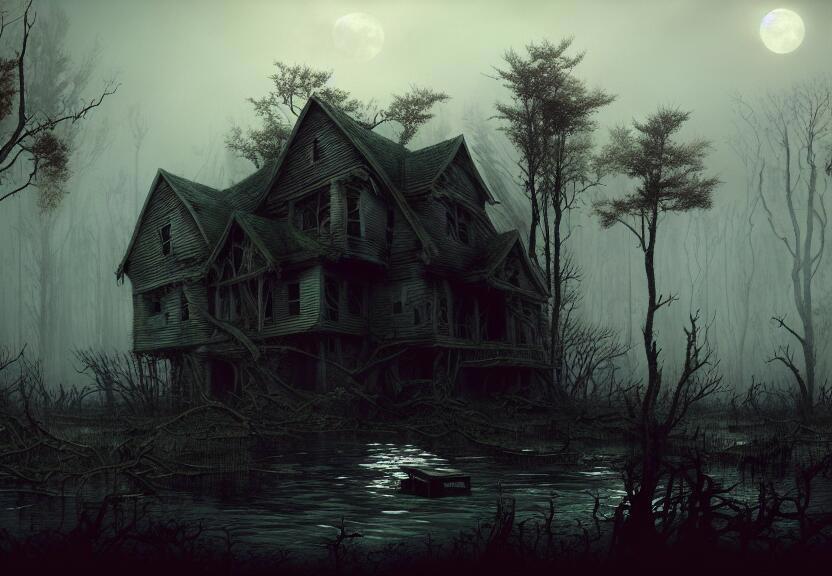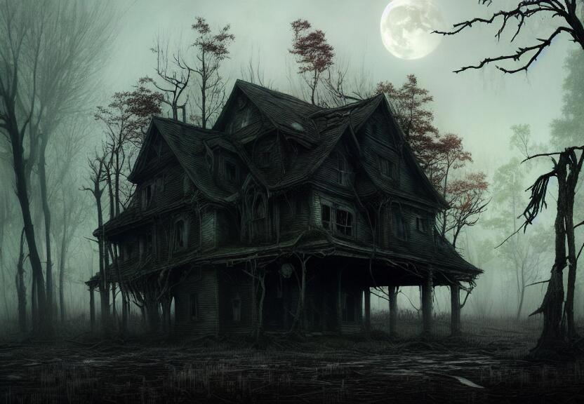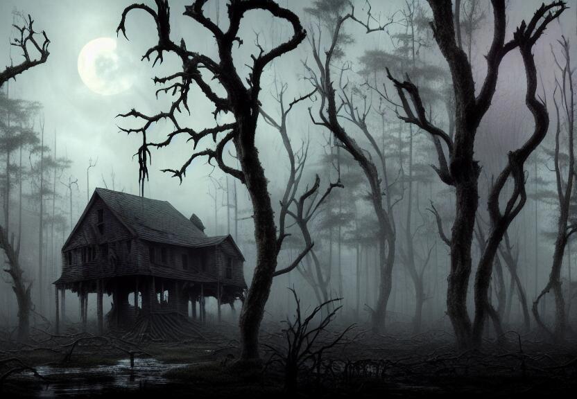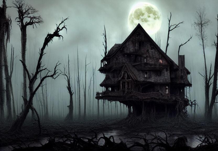 Описание: decrepit wooden witch house standing amidst swamp, twisted dead trees around, fog clouds drifting over ground, under a pale moon, by Greg Rutkowski and Wayne Barlowe and Gustave Doré, Eldritch, horror, post-apocalyptic, sinister, digital art, octane render, masterpiece, hyper detailed, sharp focus, soft light, ray tracing, trending on artstation