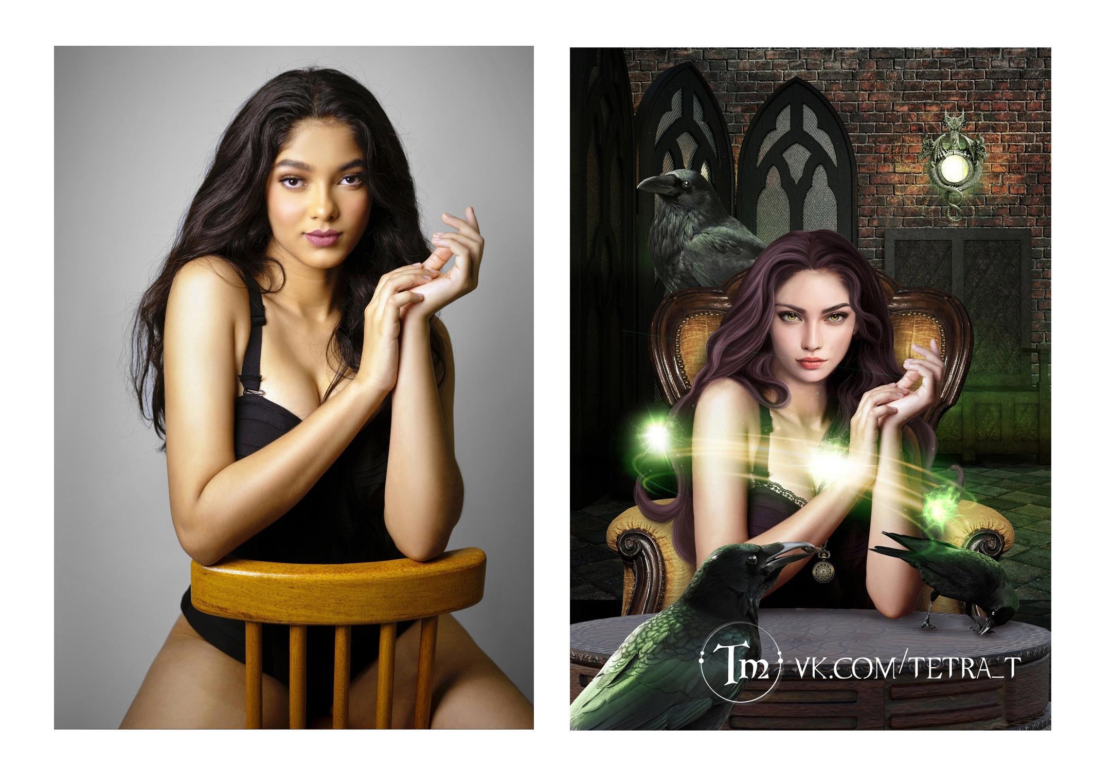 Когда я увидела эту девушку, то сразу поняла, что хочу сделать из нее ведьму. Говорят, магия есть в каждой женщине — что же, здесь она буквально на лицо. Мне очень понравилась поза, ее уверенная грация, распущенные волосы. Да, поработать пришлось немало, но зато результат полностью совпал с картинкой, возникшей у меня в голове: эта красотка точно знает себе цену, она талантлива и умна, и точно заслуживает места главной героини какой-нибудь истории.