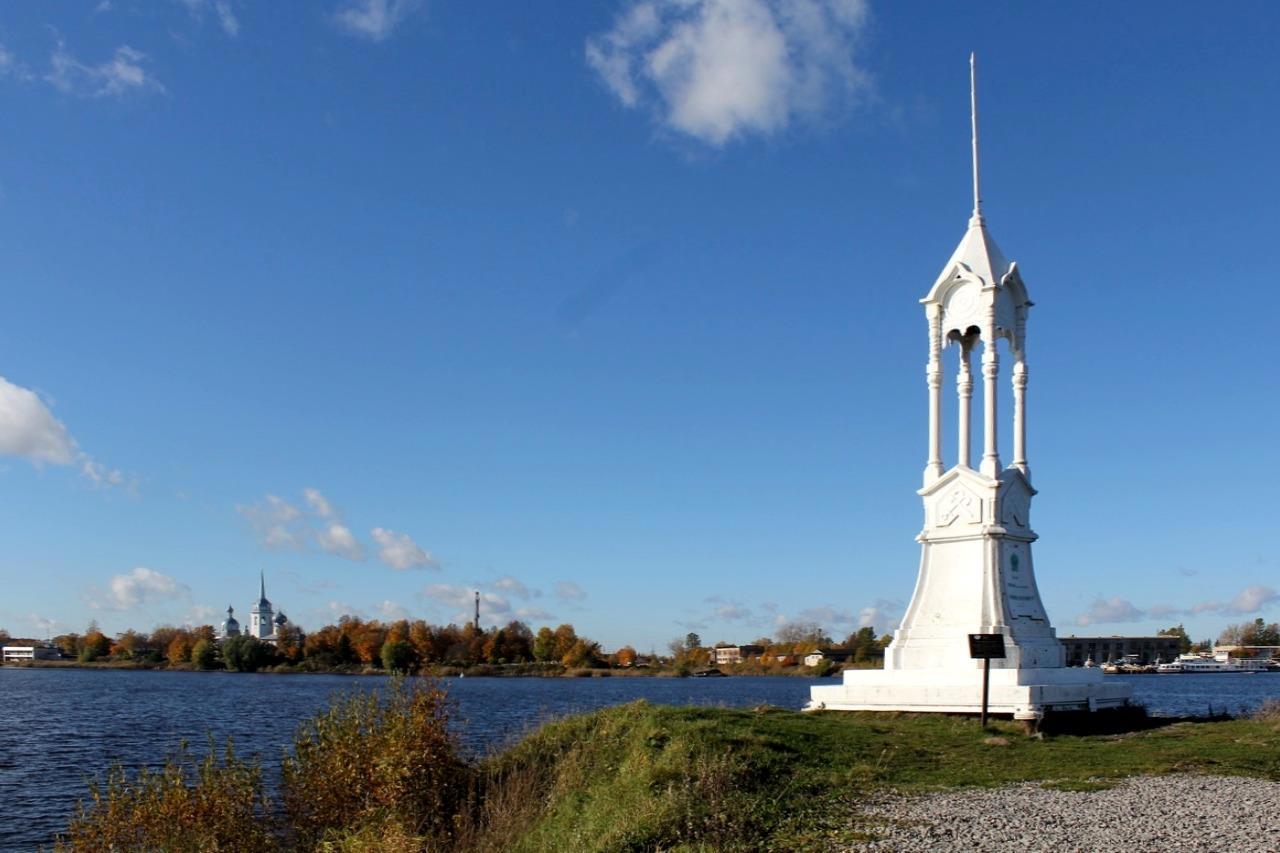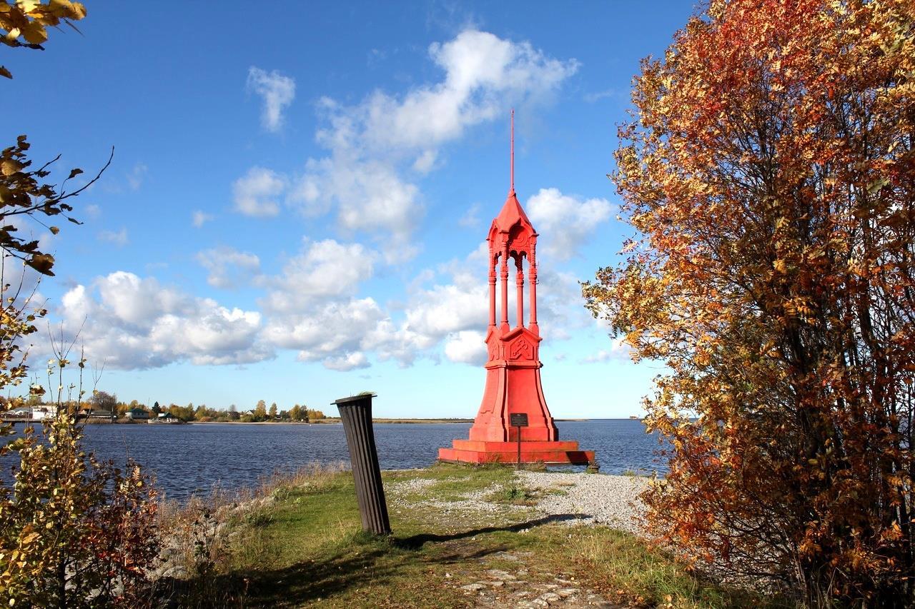 Створный знак на Ладожском канале. На заднем плане - Рождественская и Никольская церкви и Новой Ладоге (слева) и Новоладожский судоремонтный завод (справа):