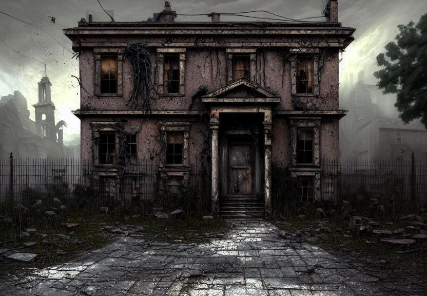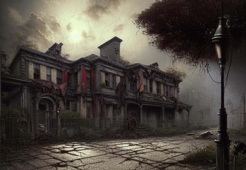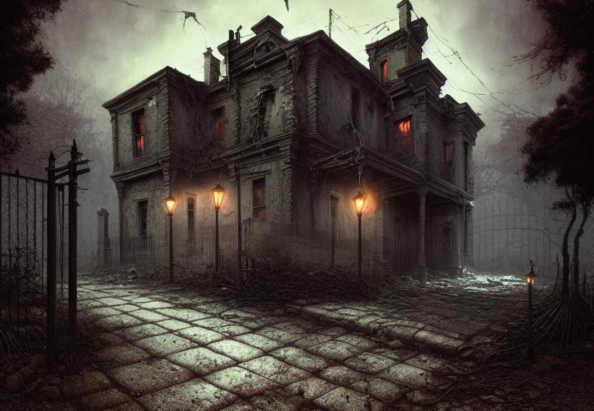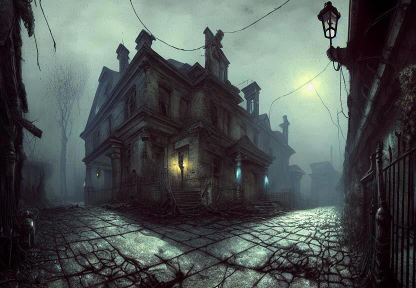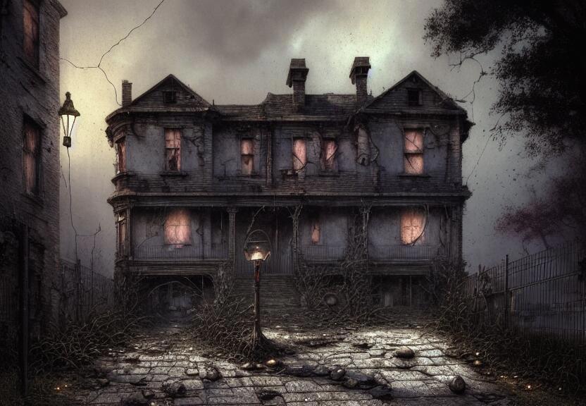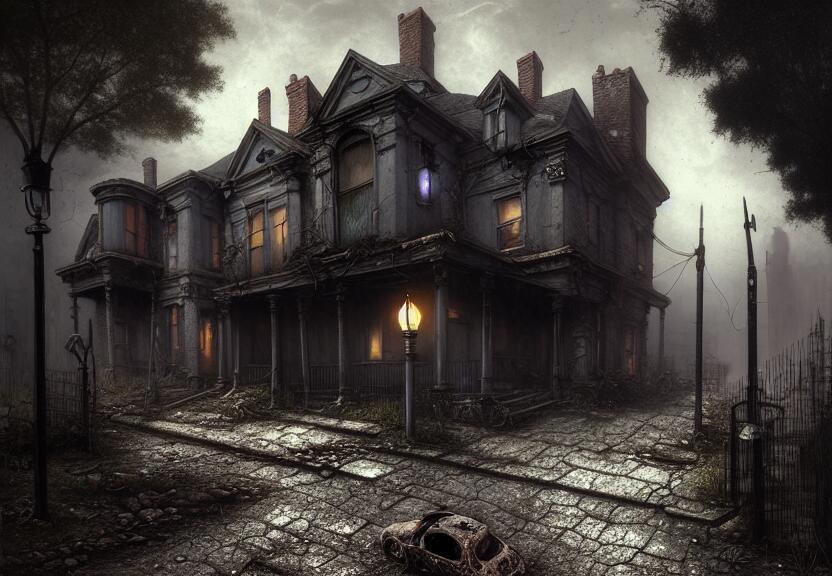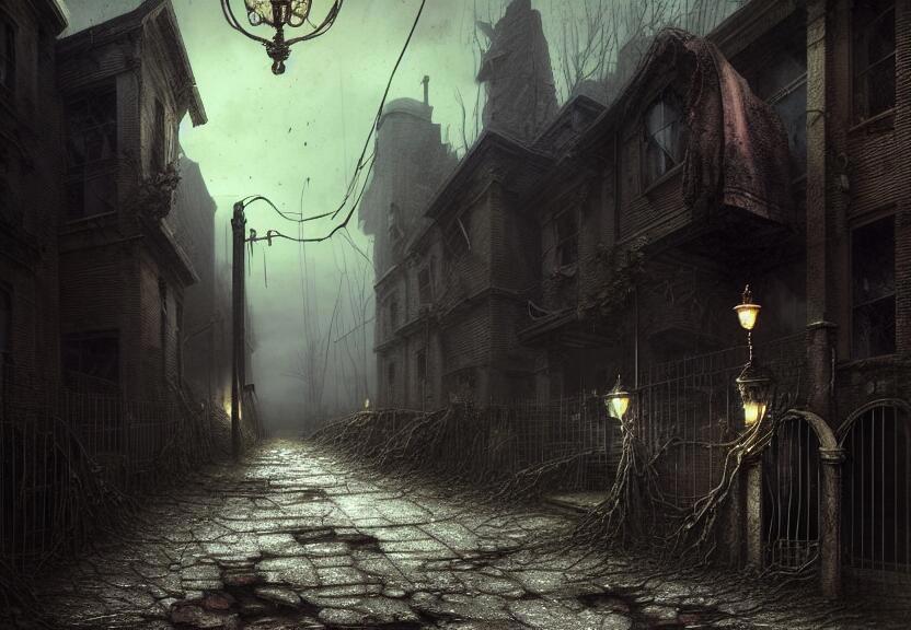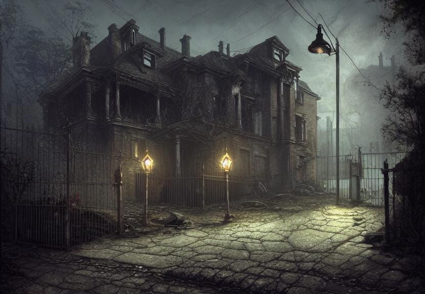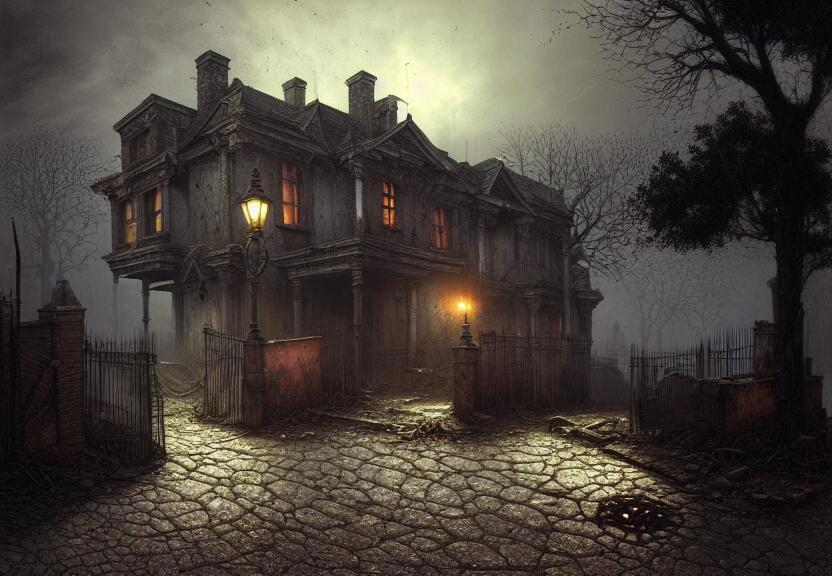 Определение: street view of decrepit mansion with rusty fence standing between neat stone houses, on stone paved street with lit lampposts, extreme long shot, by Greg Rutkowski and Wayne Barlowe and Gustave Doré, Eldritch, sinister, horror, post-apocalyptic, digital art, octane render, masterpiece, hyper detailed, sharp focus, soft light, ray tracing