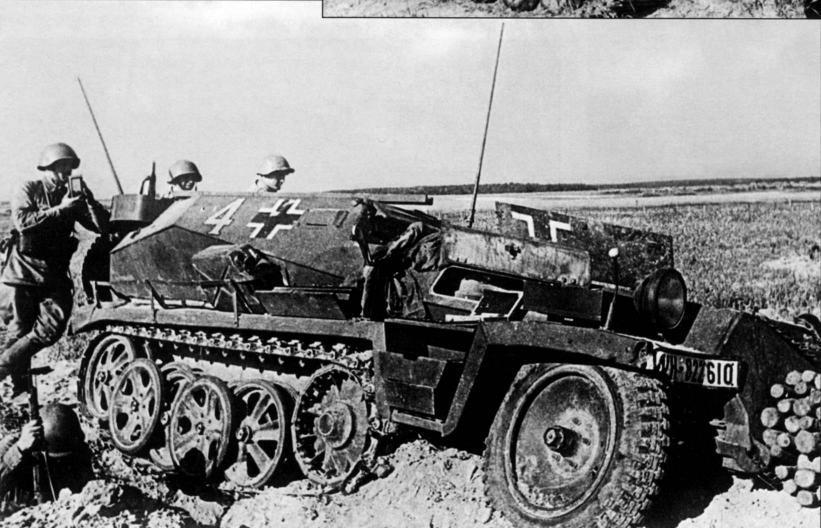 12 июля 1941 года в прочности этой обороны пришлось убедиться танкистам немецкой 3-й танковой дивизии. 5-я рота 2-ого батальона танкового полка дивизии, попытавшись атаковать позиции полка Кутепова, напоролась на минное поле и была прицельно расстреляна огнем противотанковой артиллерии. Не обошлось без тяжелых потерь ив введенной в бой в попытке прикрыть гибнущих камерадов 8-й роте. Всего за тот день немцы, по собственным данным, на этом участке только безвозвратно потеряли 18 танков, что по меркам июля 41-ого и боя против пехоты было достаточно редким событием. Судя по явно видным на фото останкам разбитых и взорванных БТР "Ганомаг", досталось также мотополку дивизии. В статье Симонова упоминаются "бронированные площадки с пехотой" – видимо, так бойцы пытались описать непривычную им в начале войны вражескую технику.