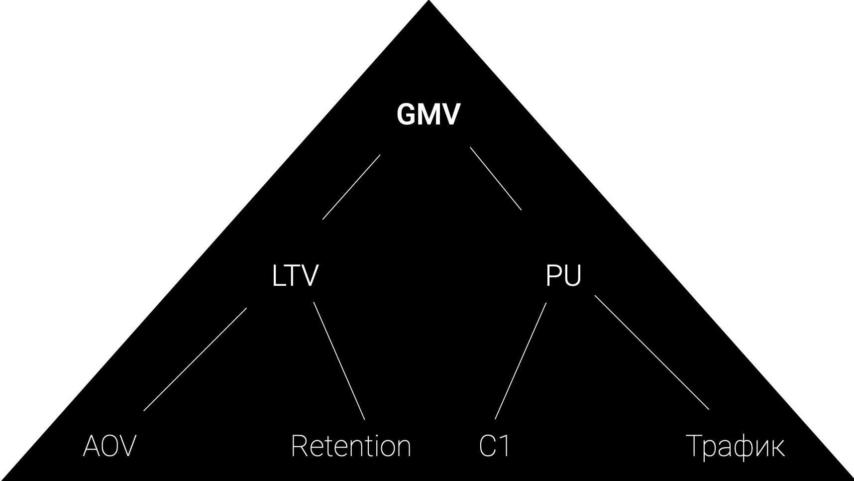 Итого, видим, что справедливой будет формула GMV = AOV*Retention*С1*Трафик. Это для общего дохода, для чистой прибыли, понятно, ещё расходы вычесть надо. И очевидно, что для получения максимума GMV (т.е., денег) нужно максимизировать каждую из его составляющих и минимизировать расходы. Как именно?