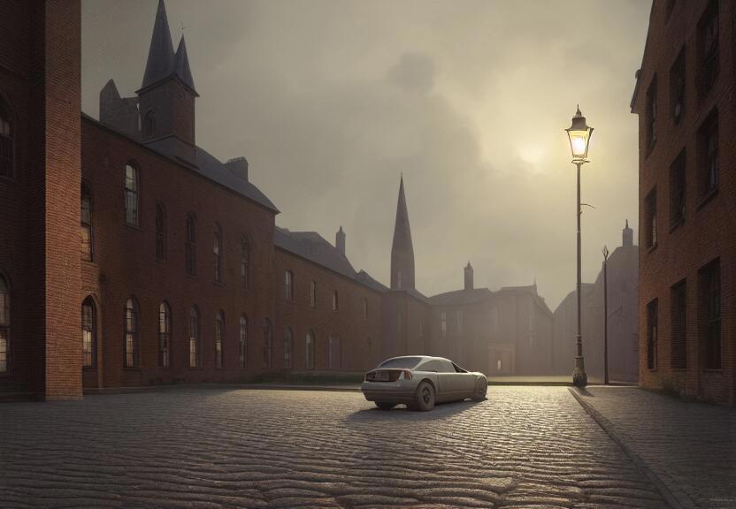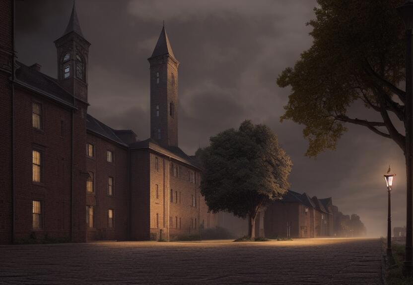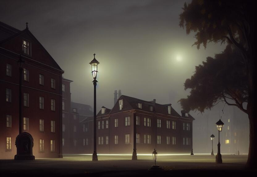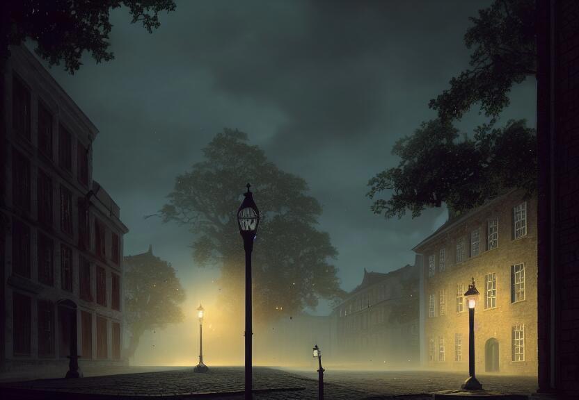 calm summer evening in provincial town, stone paved roads with lampposts and oak trees, street view of old massive brick university building with lit windows, Arkham, by Greg Rutkowski and Simon Bisley and Donato Giancola, digital art, octane render, masterpiece, hyper detailed, sharp focus, soft light