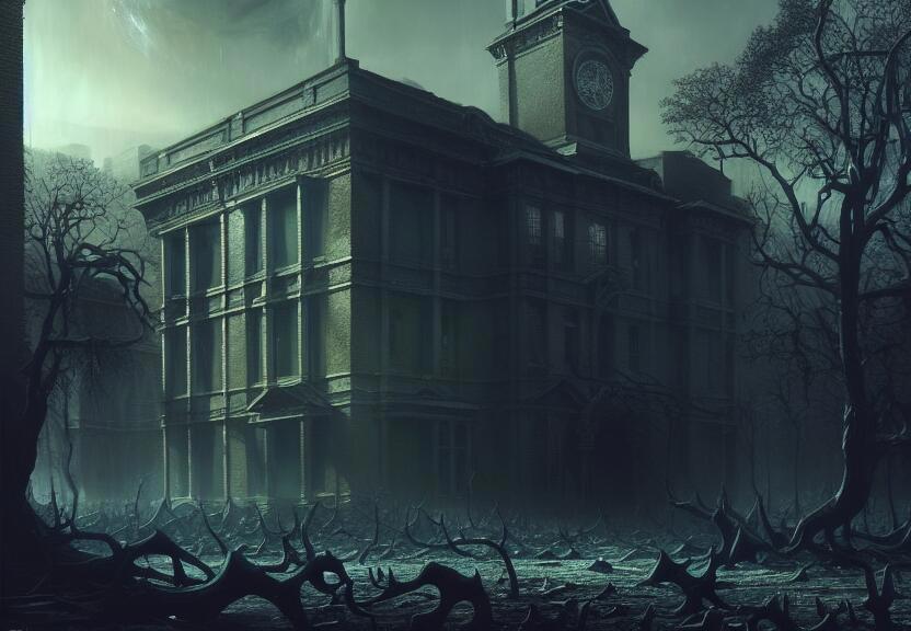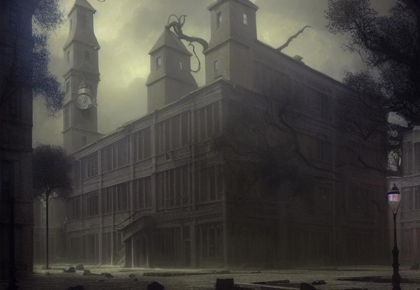 an old Miskatonic university building adjacent to big square with old oaks, by Greg Rutkowski and Wayne Barlowe and Gustave Doré, Eldritch, sinister, horror, post-apocalyptic, digital art, octane render, masterpiece, hyper detailed, sharp focus, soft light, ray tracing, trending on artstation
