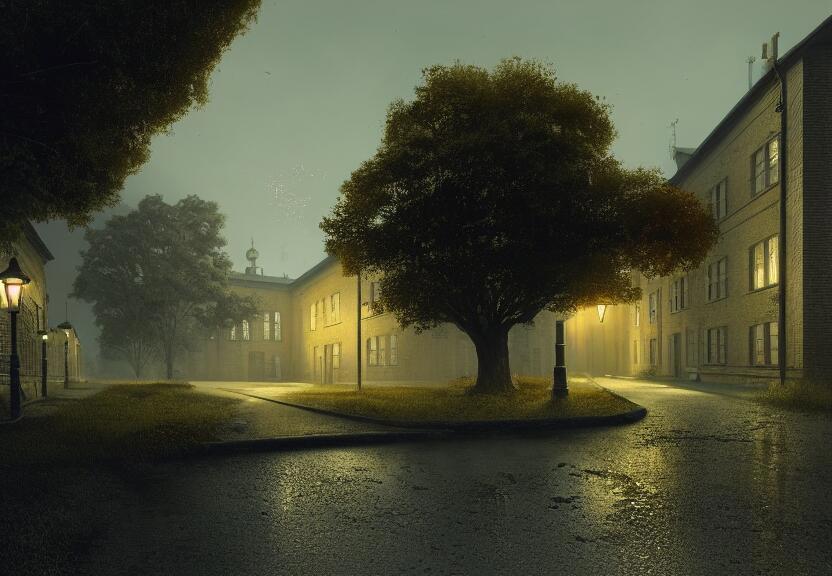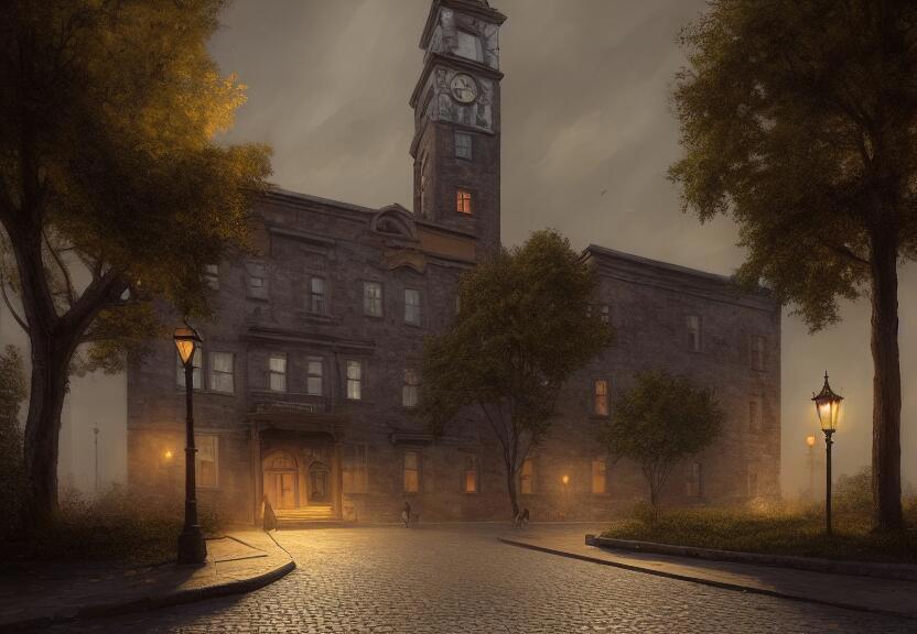 an old Miskatonic university building adjacent to big square with old oaks, calm provincial town, lit lampposts, by Greg Rutkowski and Wayne Barlowe and Gustave Doré, Eldritch, sinister, digital art, octane render, masterpiece, hyper detailed, sharp focus, soft light, ray tracing, trending on artstation