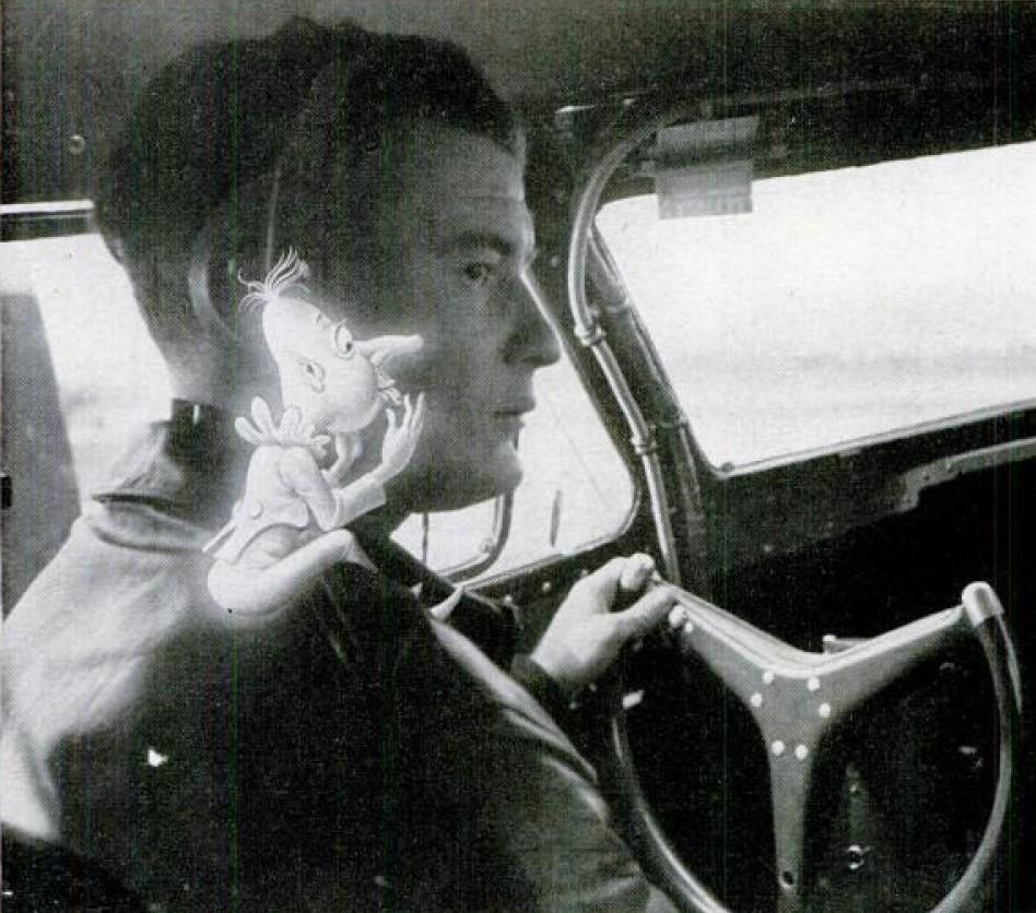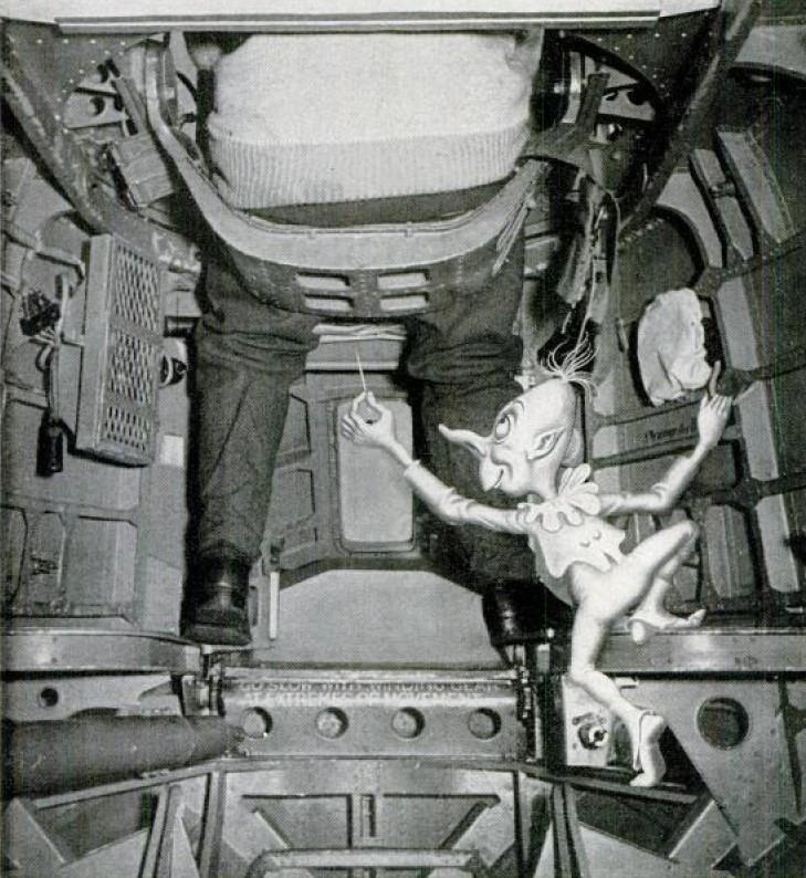 Щекотание навигатора производится только в решающий момент. Этого штурмана с огорченным выражением лица щекочут, когда он пытается удержаться на ногах, чтобы полюбоваться небесным зрелищем. Приборные доски (слева) - прекрасные игровые площадки для гремлинов. Им нравится раскачиваться на искусственных горках и делать карусель из гироскопического компаса.