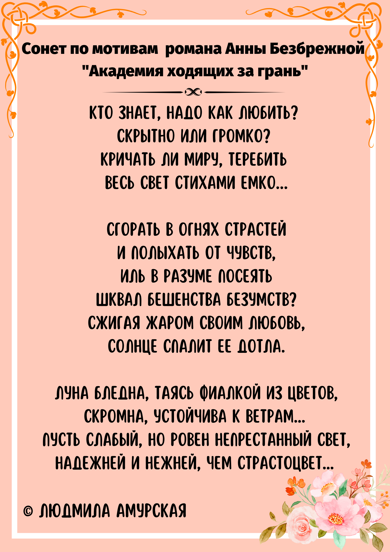 Сонет написала Людмила Амурская, член Союза журналистов России, писатель, поэт, публицист, литературовед и редактор литературно-художественного альманаха "Иной взгляд".
