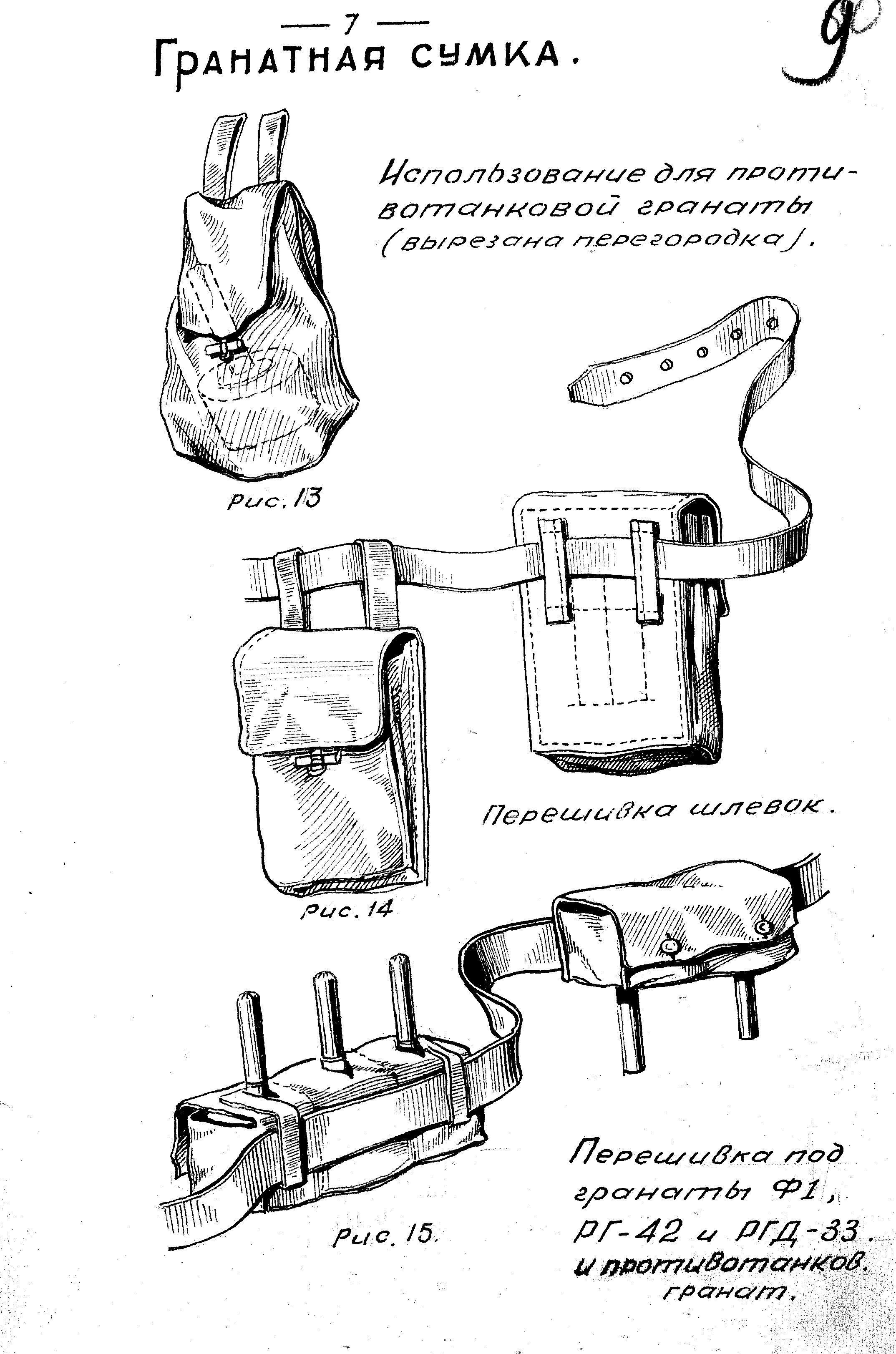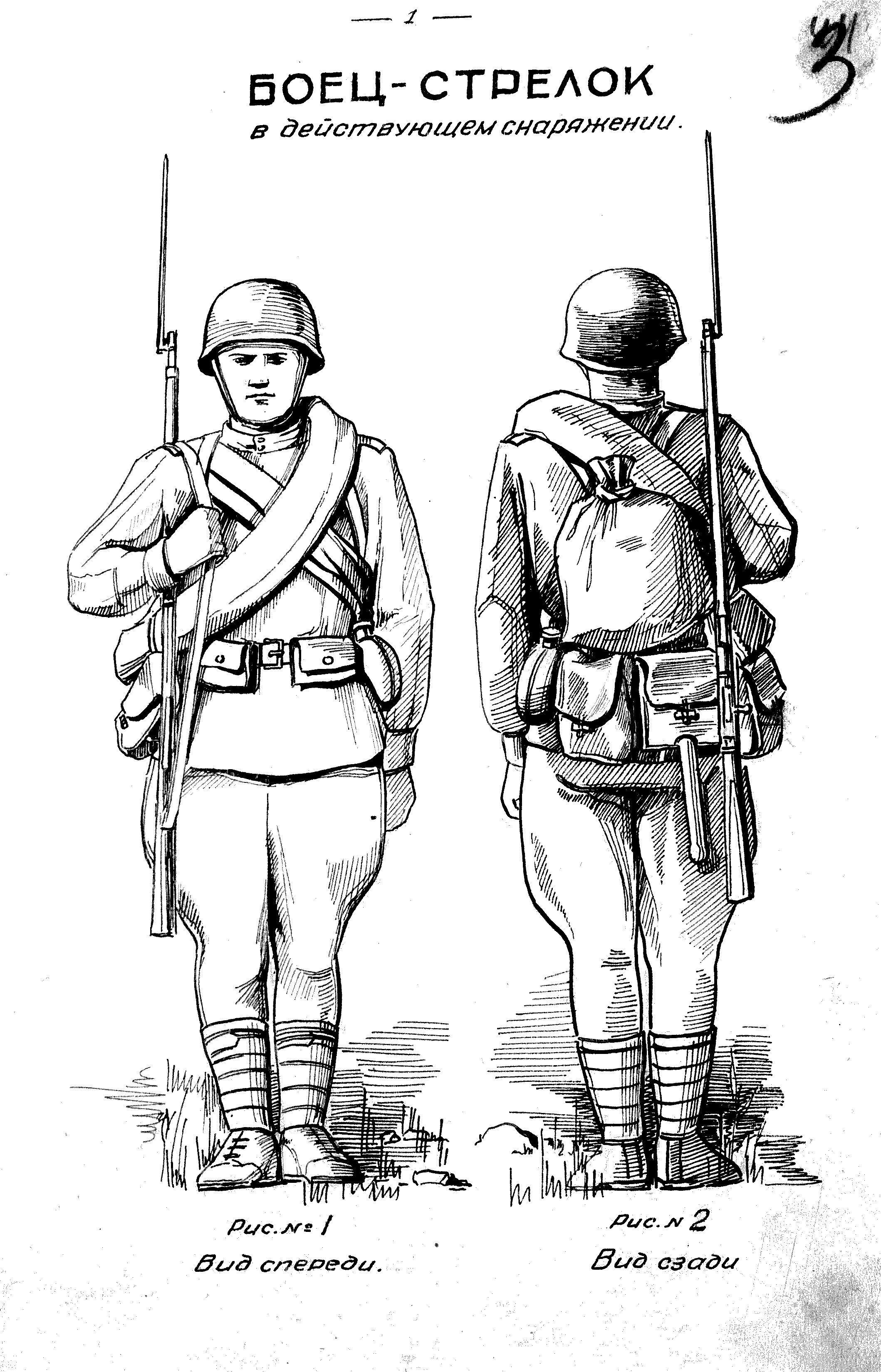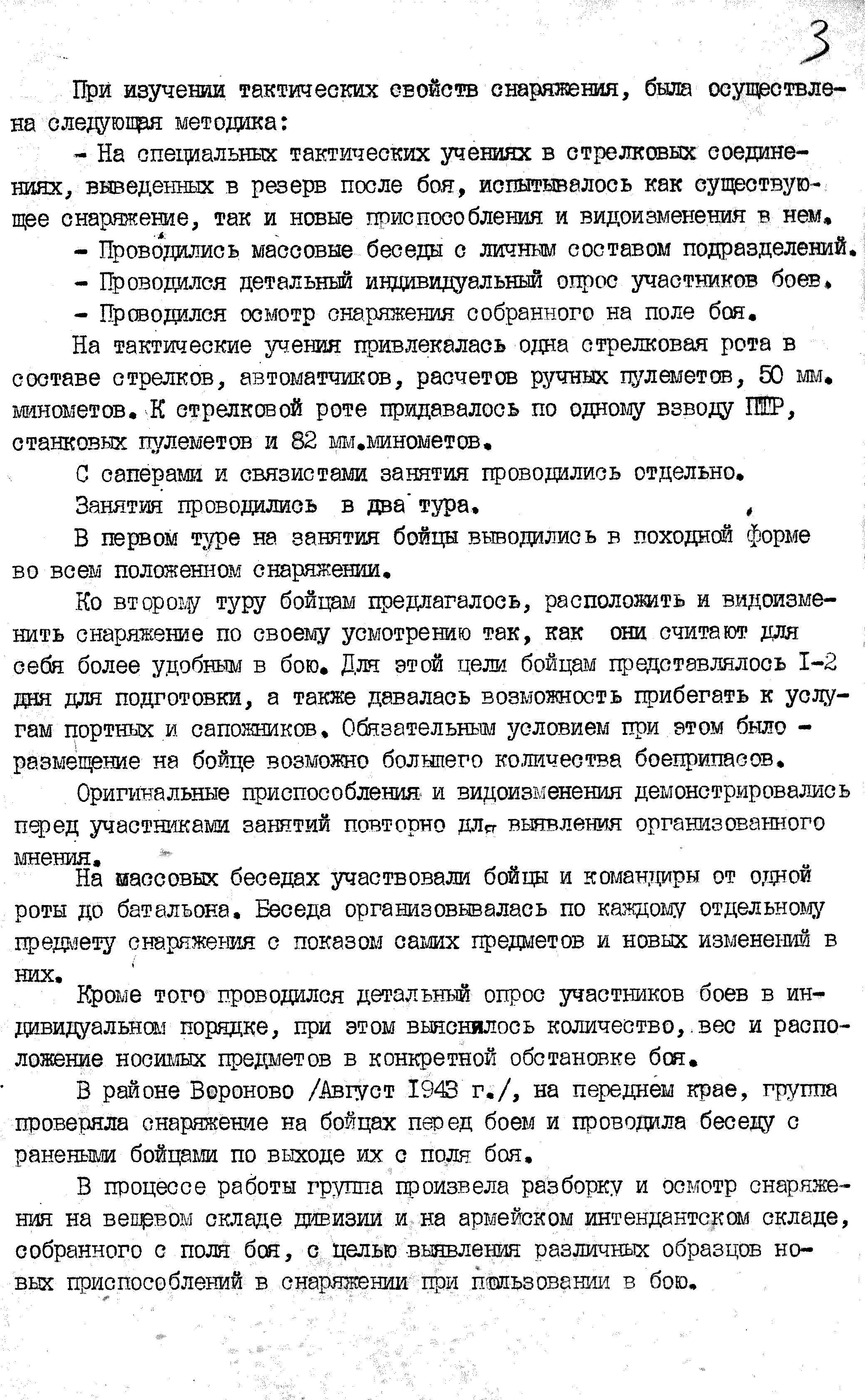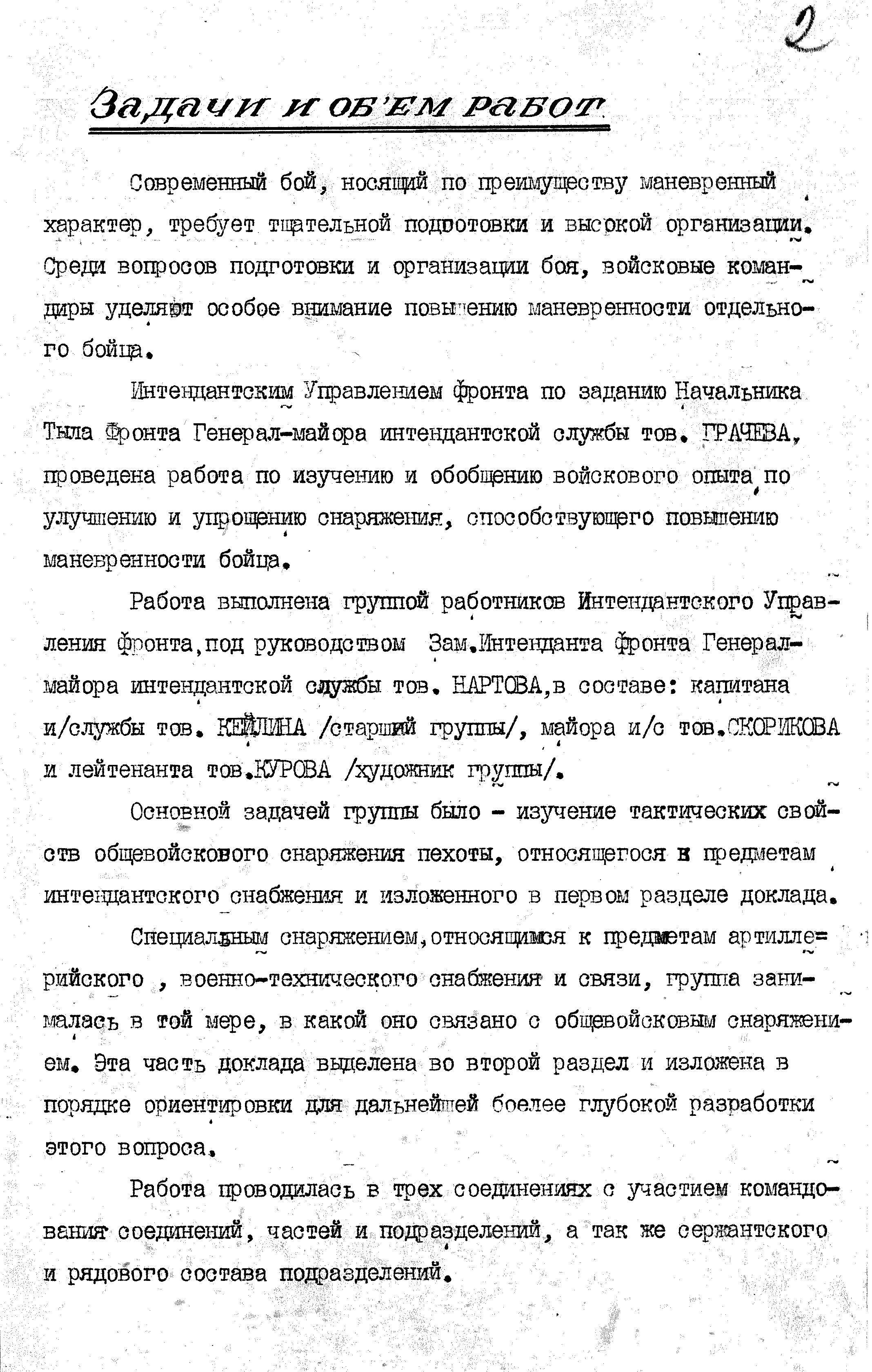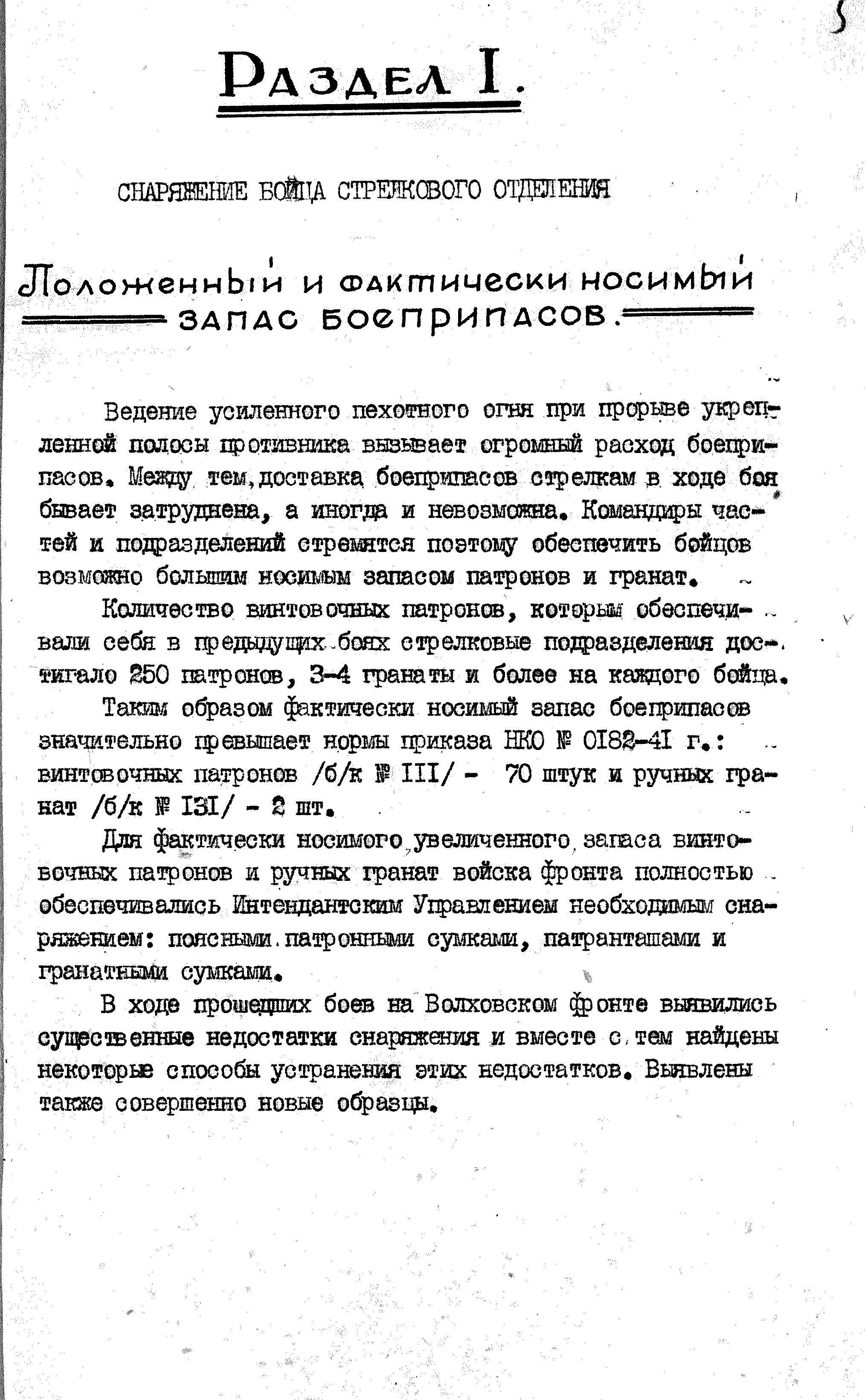 Среди нескольких документов, посвящённых этому вопросу, сохранился один, который сразу вызвал особый интерес. Полное название работы: "Доклад о результатах изучения тактических свойств снаряжения пехоты и необходимых изменениях по опыту войск Волхвовского фронта.". Это обобщённый результат работы группы интендантов фронта за период с 1943 по февраль 1944 г. Документ объемный, состоит из двух альбомов: текстового доклада и альбома с рисунками. Каждый альбом разбит на два раздела: 1. Снаряжение бойца стрелкового отделения и 2. Снаряжение бойцов специальных подразделений стрелковой дивизии.