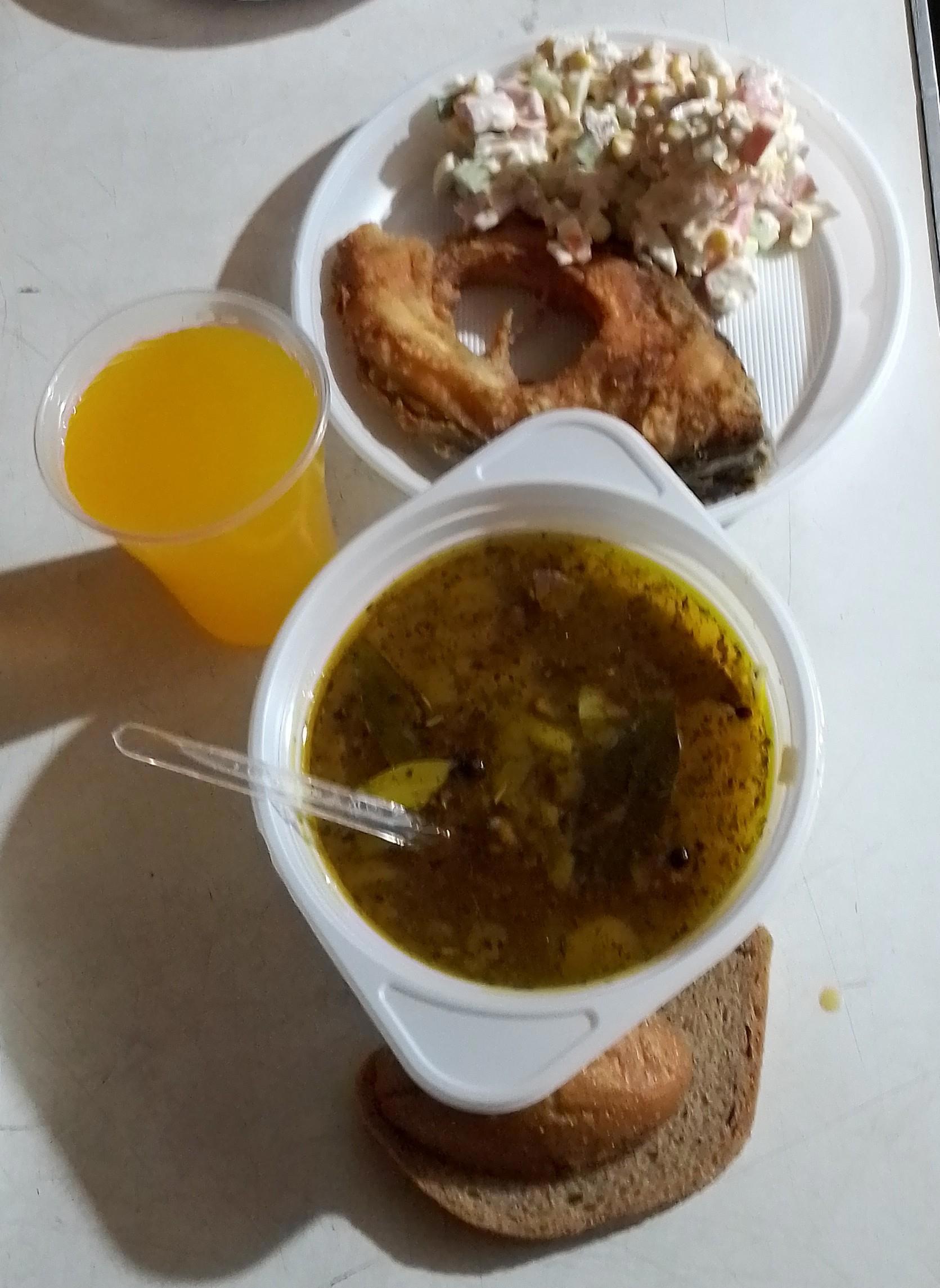 Итак, ощущения праздника создают вторые блюда. Суп (или борщ) - на базе дело привычное. А на второе у нас сегодня (на выбор): каша, мясная подлива, жаренная рыба и салат. И апельсиновый сок. Выбор - на фото. Вкусно - обалдеть. Но рыбу осилил лишь наполовину - место закончилось у