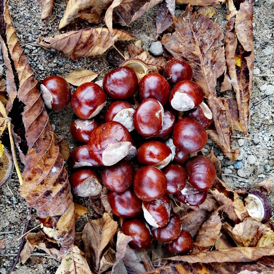 Неподалёку - покрытые "ржавчиной" конские каштаны. Плоды у них удивительно красивые.
