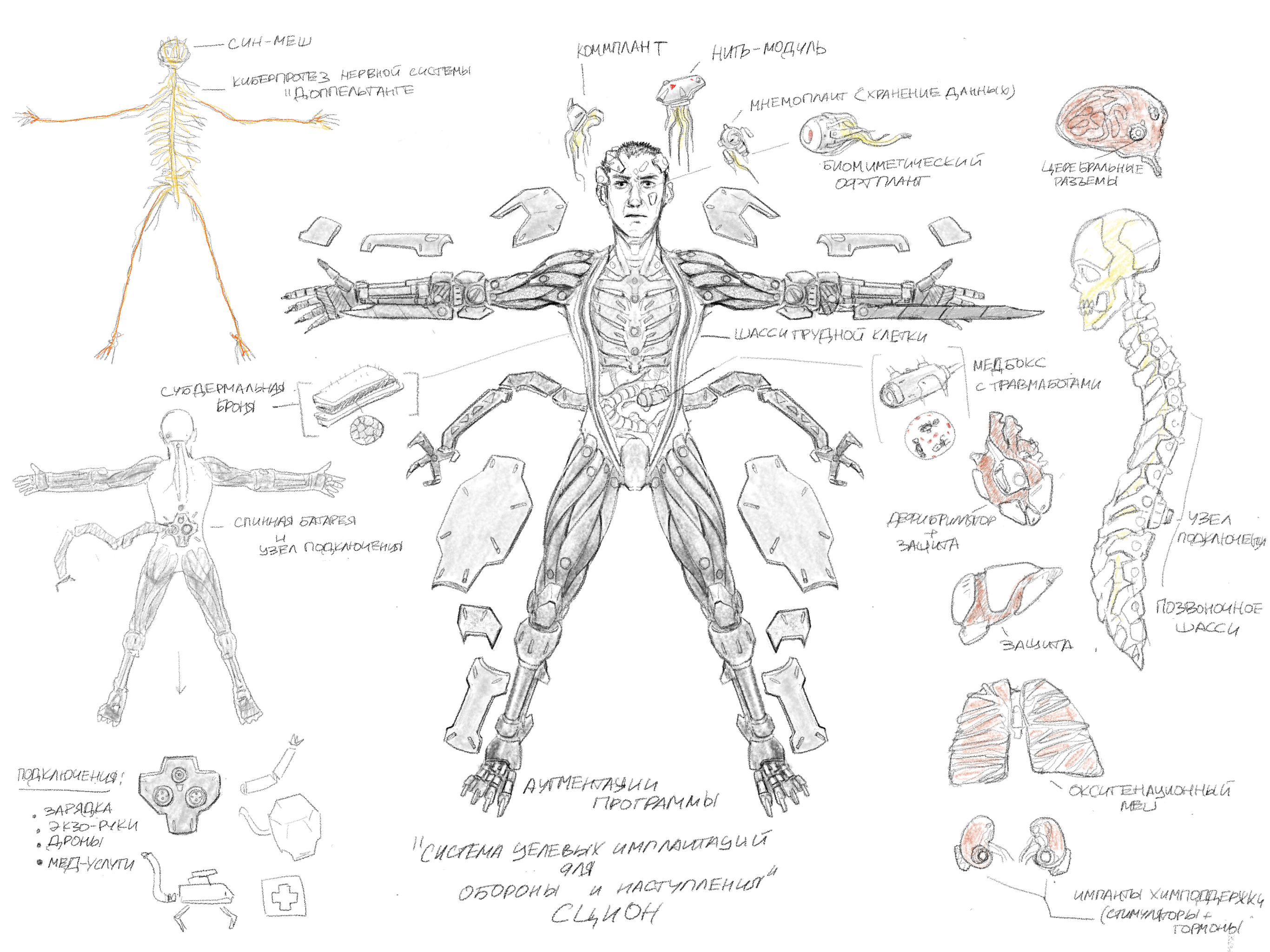 - Под кожу зашиваются пластины гибкой субдермальной брони, также выполняющей функцию термоэлектрического генератора для питания базовой батареи.