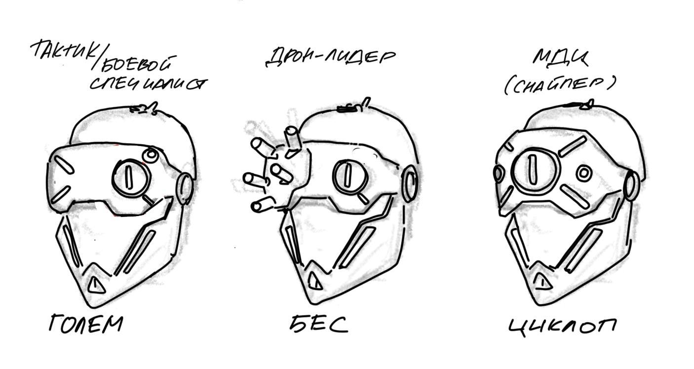 «Бес» с дополнительными антеннами - шлем для Дрон-Лидера, а «Циклоп» с усиленным дополнительным прицелом - для менеджера дальних целей.