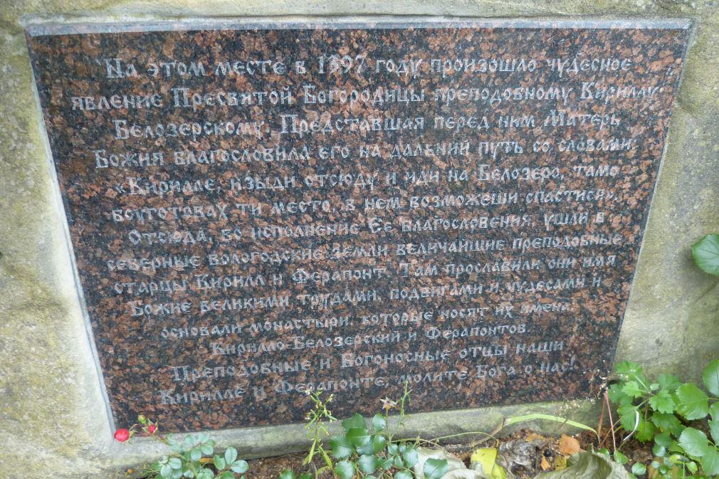 Её поставили на том самом месте, где когда-то располагалась келья инока Кирилла. В 1397 году этому шестидесятилетнему монаху было видение. Он услышал женский голос, обращённый к нему: