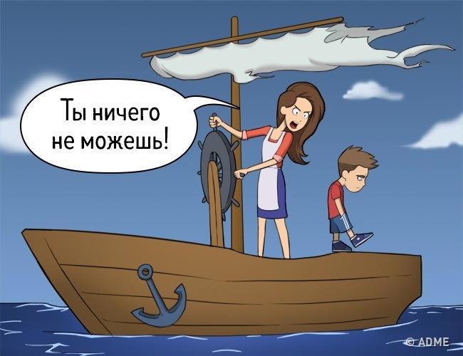 В качестве самого простого примера: когда ребенок лет в 4-6 пытается помогать маме, то получается у него плохо. (Координация еще недостаточно развита.) И если мама будет очень критичной и постоянно будет его ругать(за то что рассыпал, разбил, намусорил, «плохо» вымыл – оставил разводы), то в итоге она «отобьет» желание этим заниматься, а заодно и желание помогать ей. А потом - не допросится помощи.