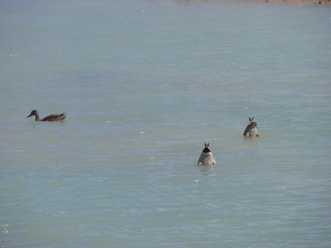 На участках, где полевые работы закончены, пошли грунтовые воды и образовалось пресное озеро. В нём плавают уточки, и даже как-то кормятся ))