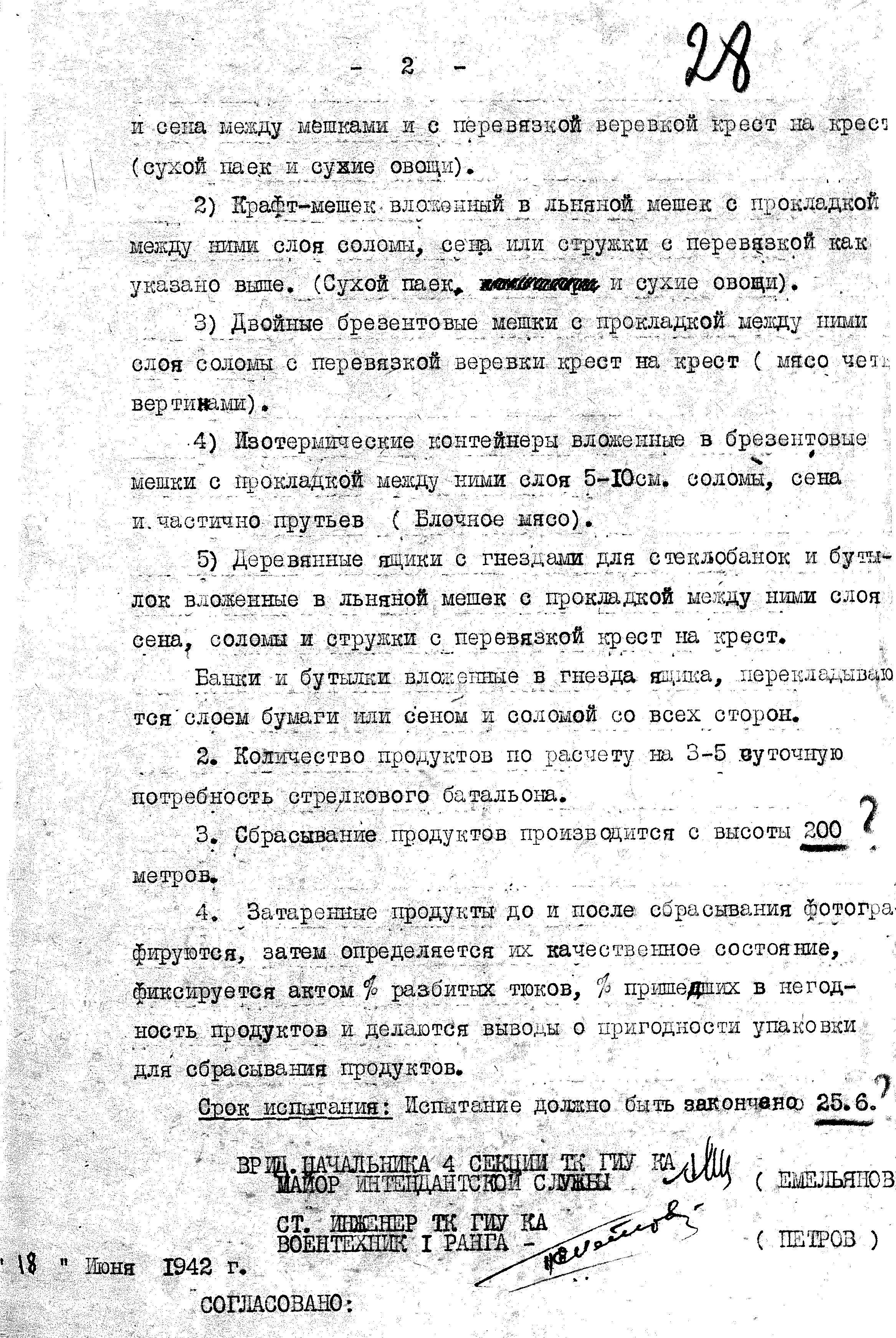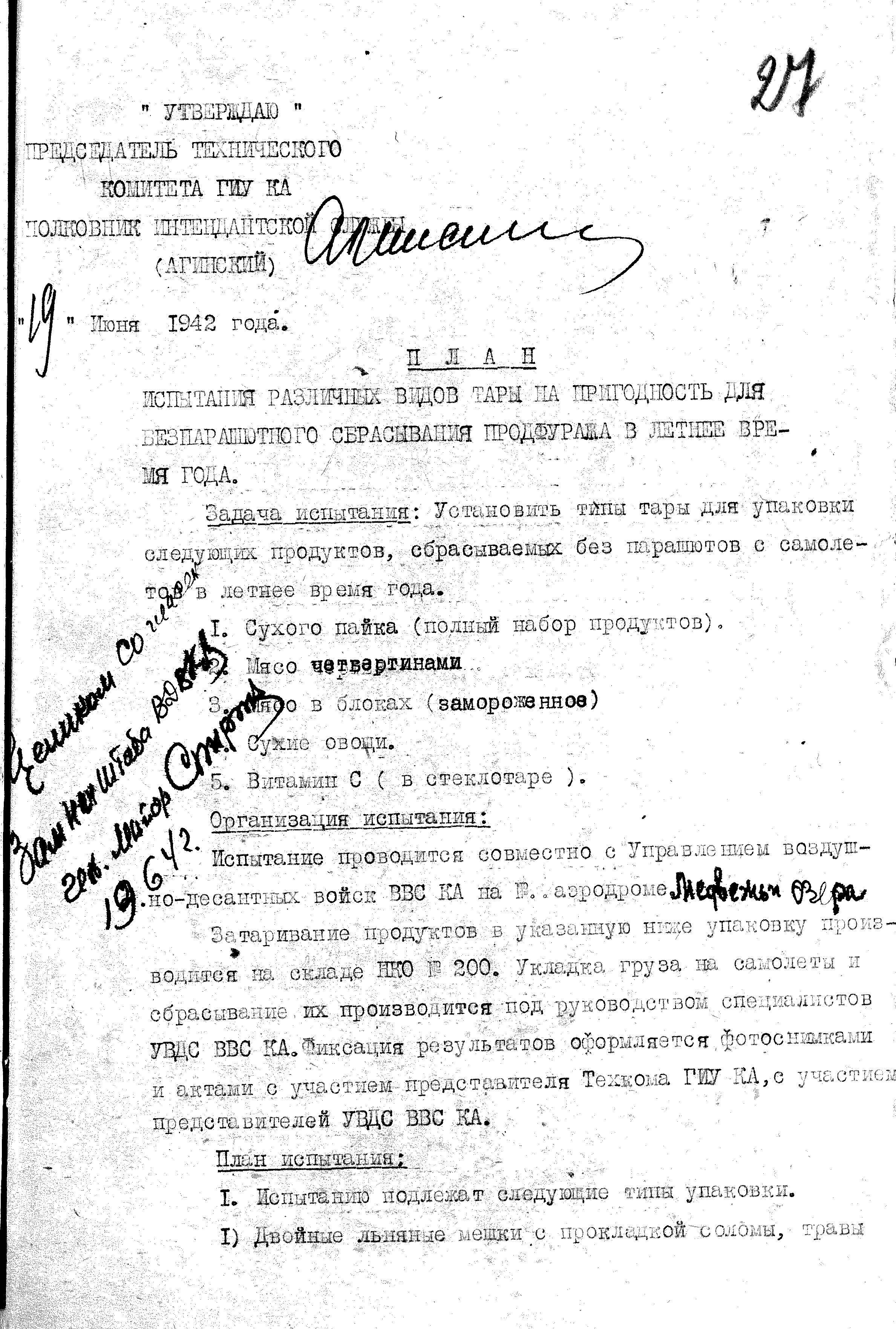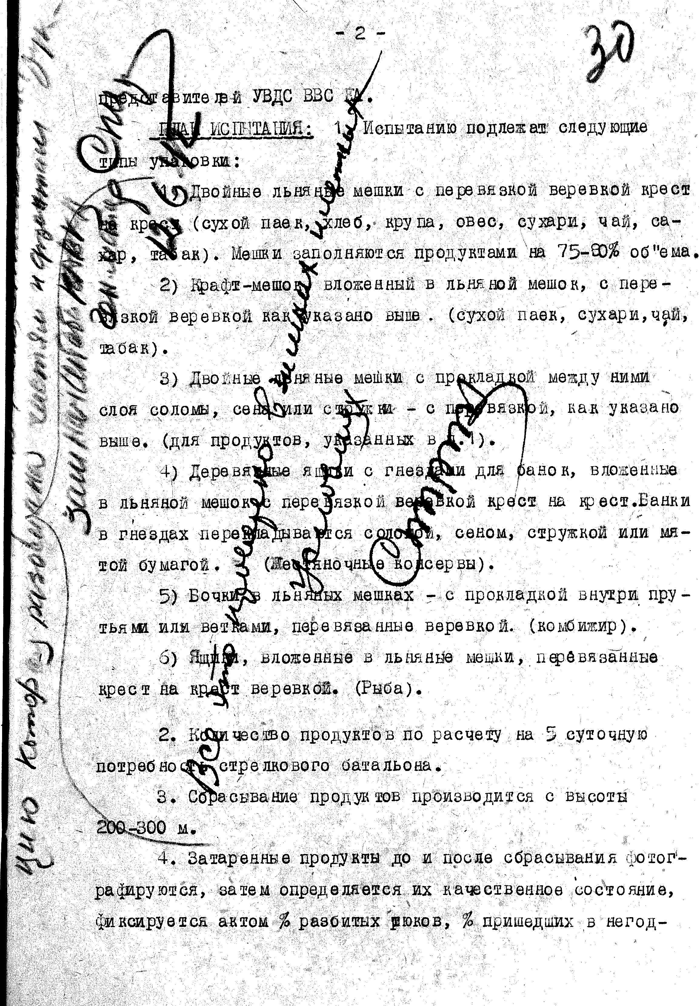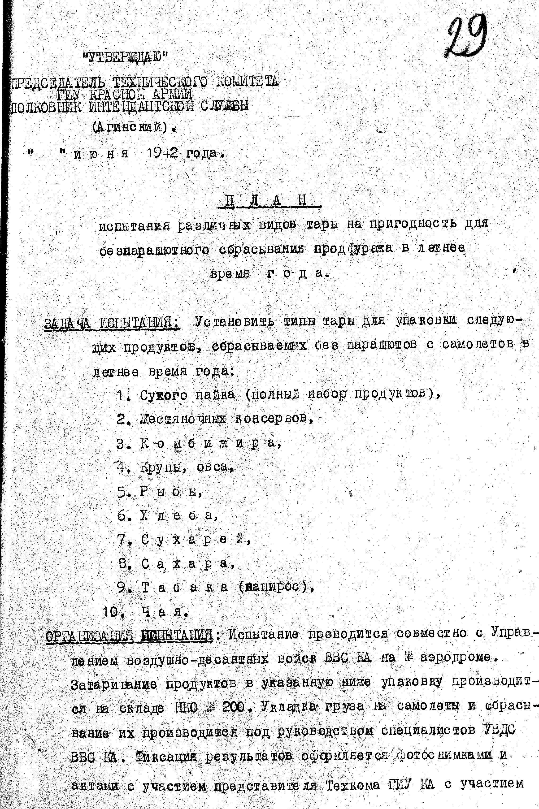 ТехКомом ГИнтУ было разработано два плана испытаний. Согласно первому, испытывалась тара для сброса пяти различных видов продовольствия: