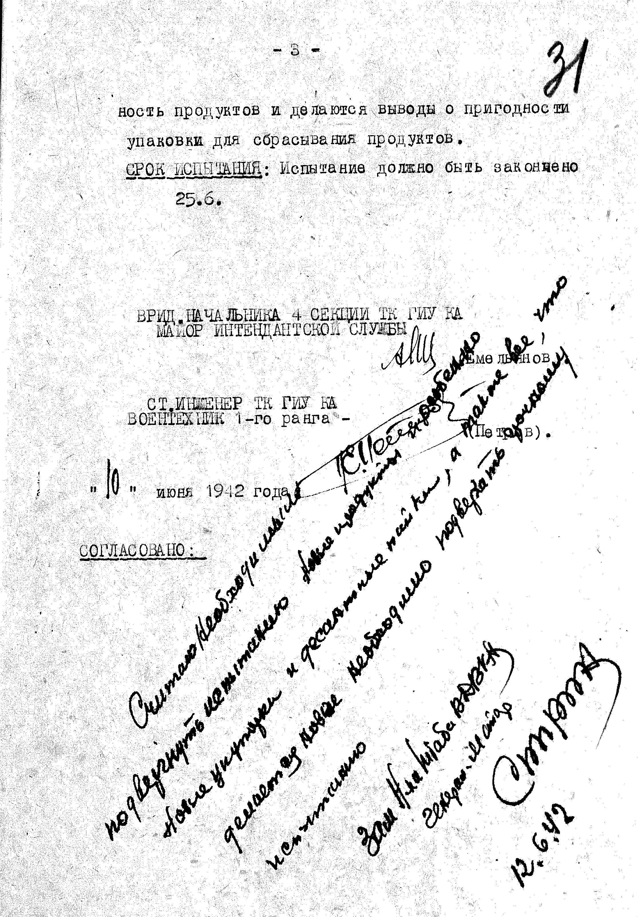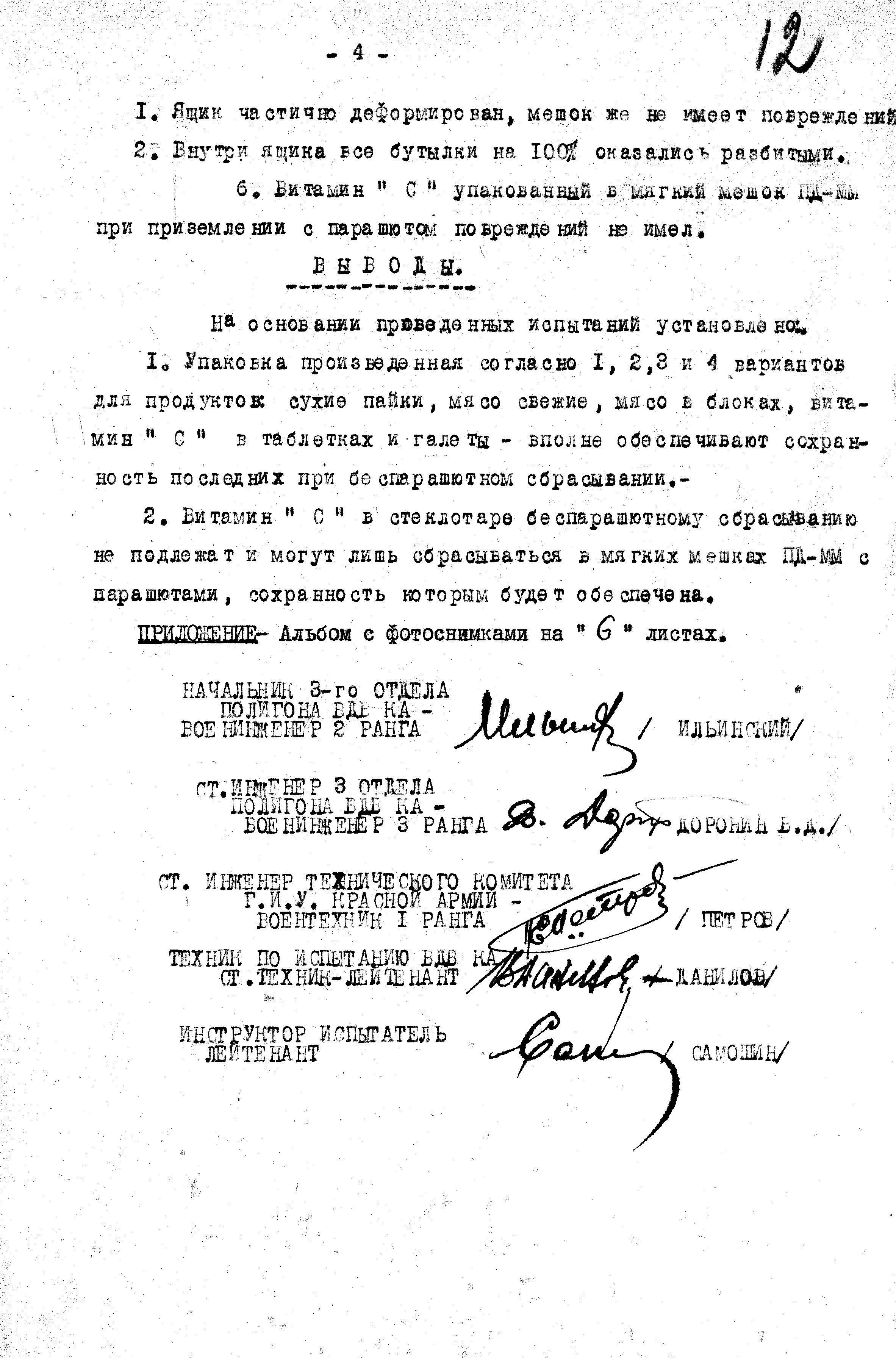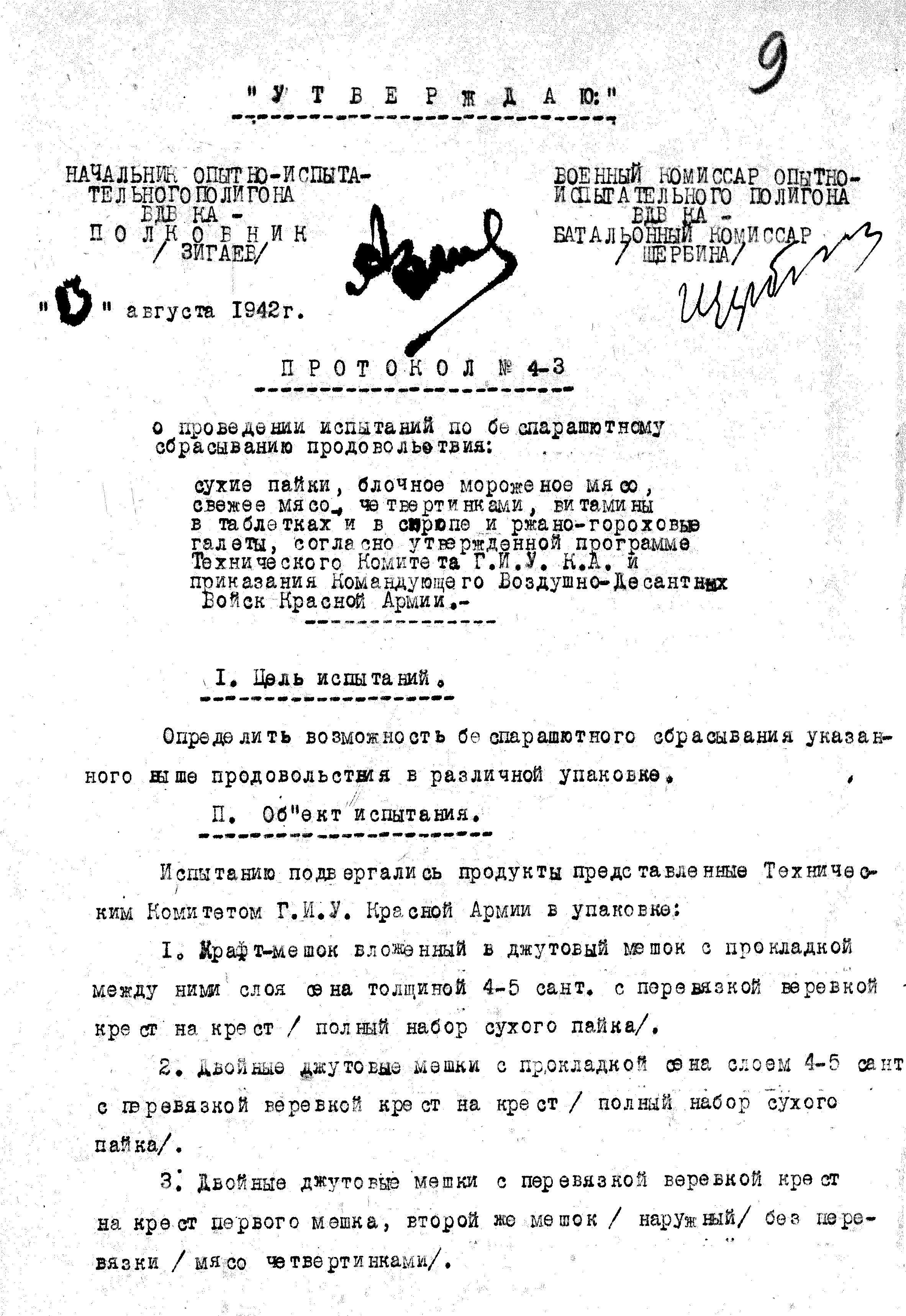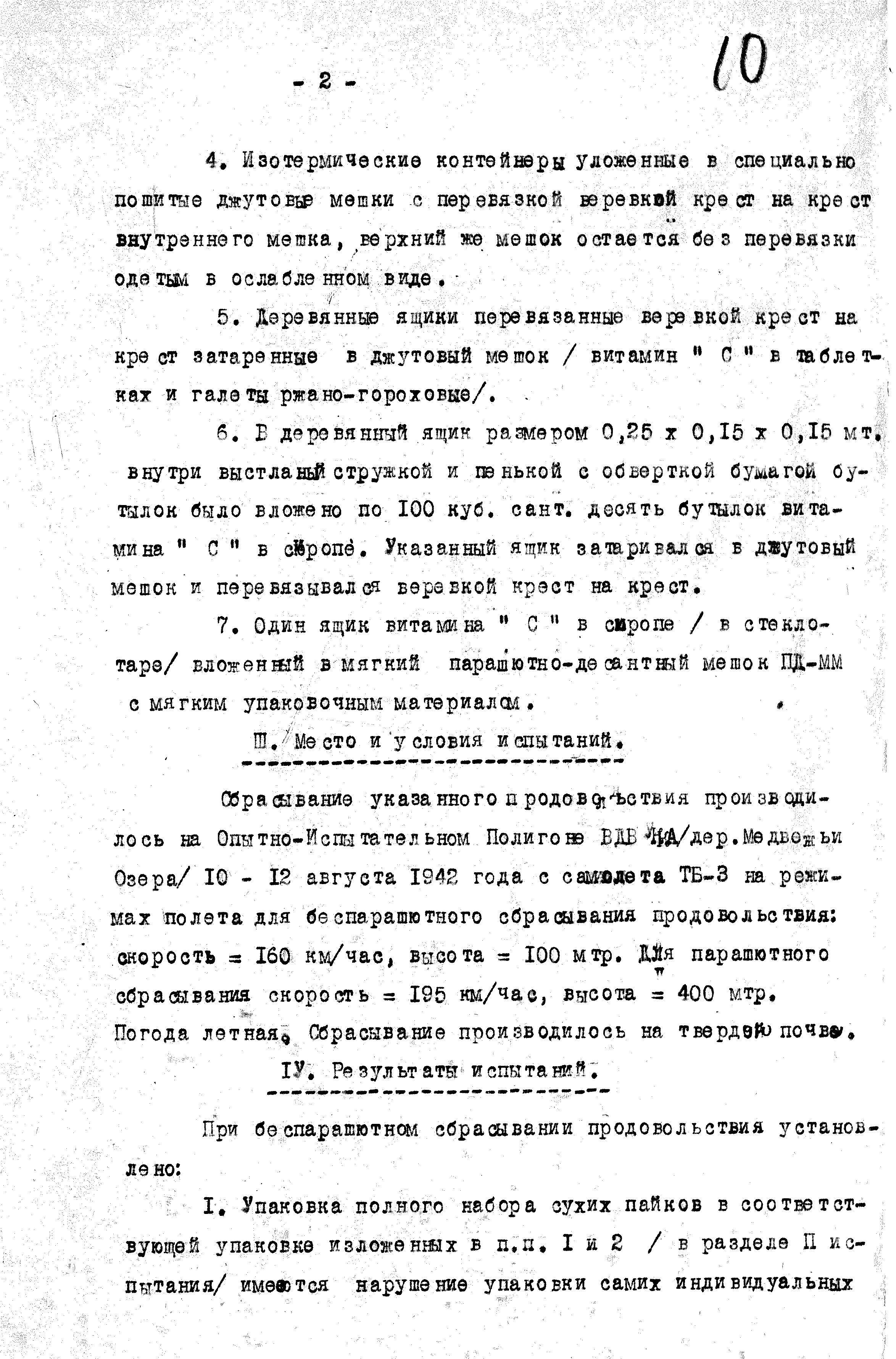 Испытания беспарашютного и парашютного способов доставки прошли на аэродроме ВДВ КА дер. Медвежьи Озёра, в период с 10 по 12 августа 1942 г. По результатам исследований был составлен "Протокол о проведении испытаний по беспарашютному сбрасыванию продовольствия":