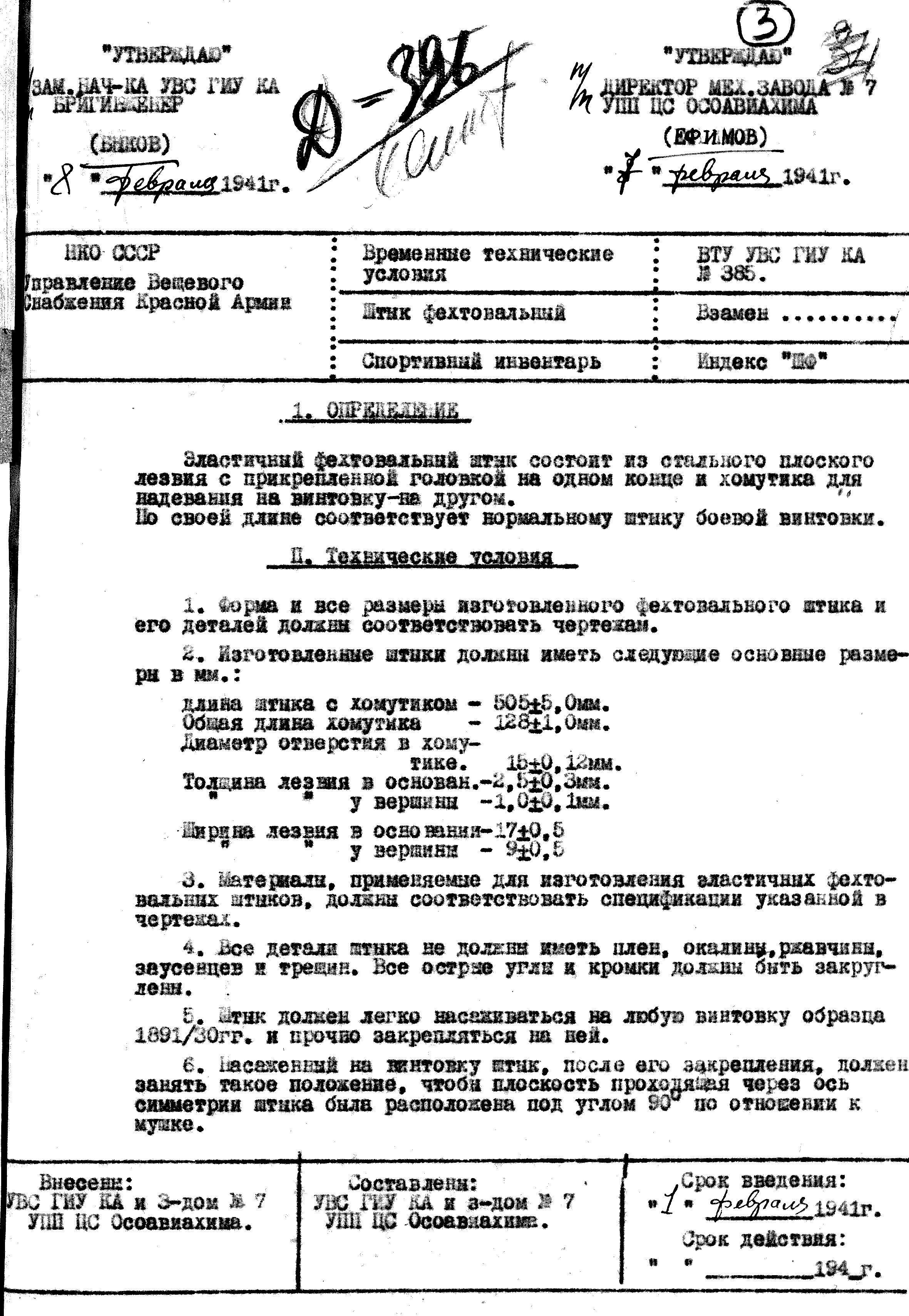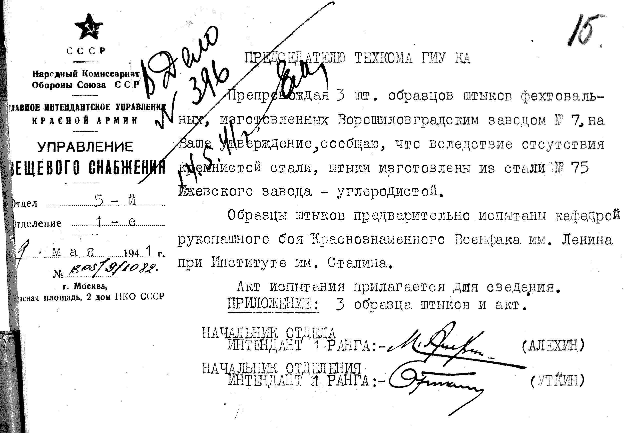 Найти в документах интендантов какие-то документы, связанные с разработкой и испытаниями оружия, даже спортивного, практически невозможно. Поэтому, увидев папку с названием "Фехтовальное снаряжение", удивился, но надеялся увидеть рисунки и описания шпаг, рапир, на худой конец - маски и защитное снаряжение, но всё оказалось куда как прозаичнее. Речь в документах шла о фехтовальных штыках.