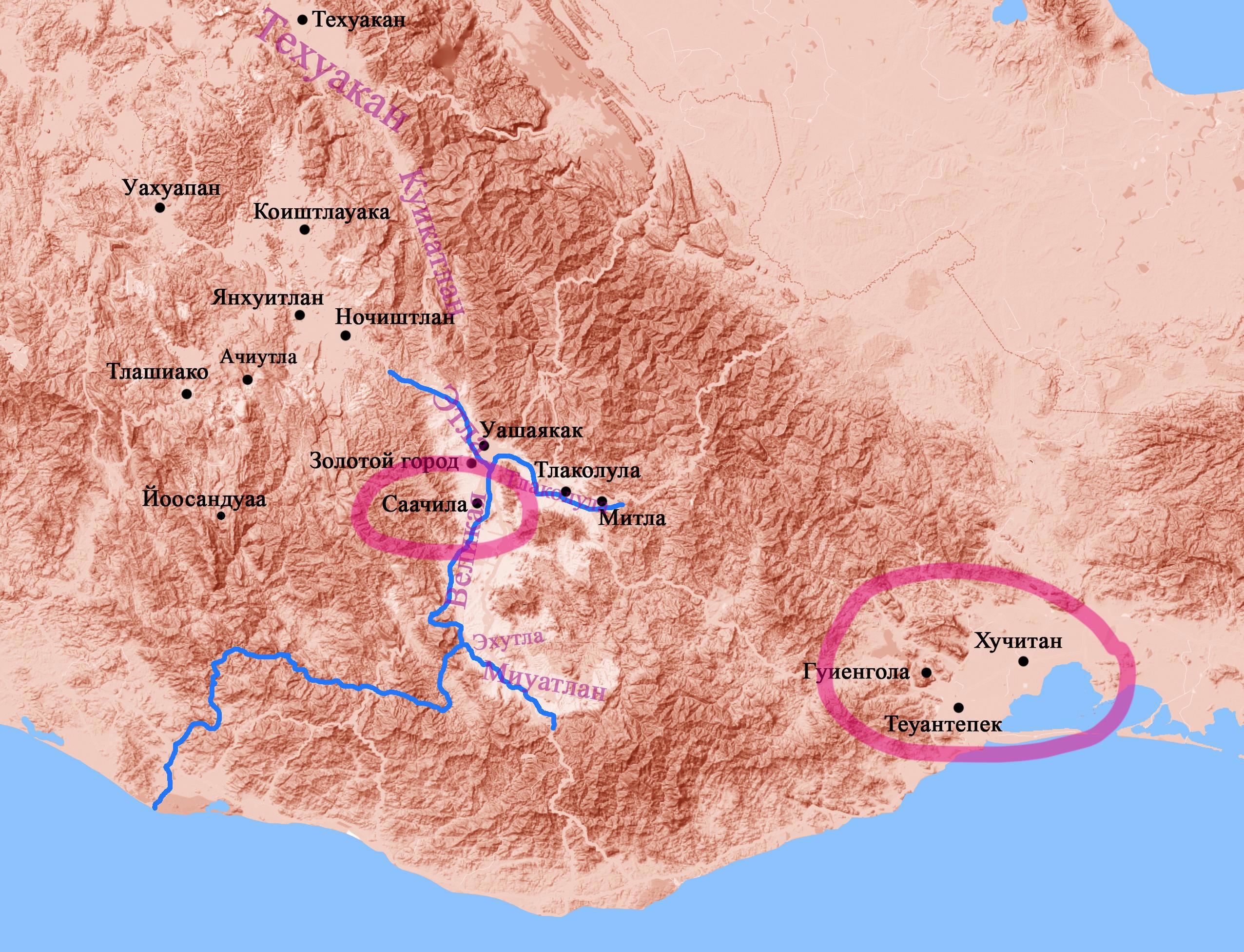 Вроде бы, ясно – Саачилой/Заачилой. На карте Мексике, в Оахаке, легко можно найти современный город Вилья де Саачила. Он? Вроде бы, да. Но каковы пределы его княжества? Мы точно знаем, что Косийоэса был одним из многих князей сапотеков. Получается, что в долинах были и другие. Саачила явно не владела всеми долинами… Зато владела городами Гиенгола (Гуиенгола), Теуантепек и прочие. Взгляните на карту – это чёрти где находится! За добрых две сотни километров от метрополии! Это что получается: землями под боком не владел, а за горами, за лесами – правил? Причем, я находил тексты, где утверждают, что и отец Косийоэсы восточными территориями правил. А он сам даже туда столицу перенес! Я вообще засомневался: может, на востоке была какая-то другая Саачила? Но на испаноязычной Вики все-таки нашел точное указание: «археологическая зона Саачила расположена в 18 километрах от Оахаки (города)». То есть, совпадает. Но с территорией княжества я так до конца и не определился. Что, увы, и проглядывает в моей книге.