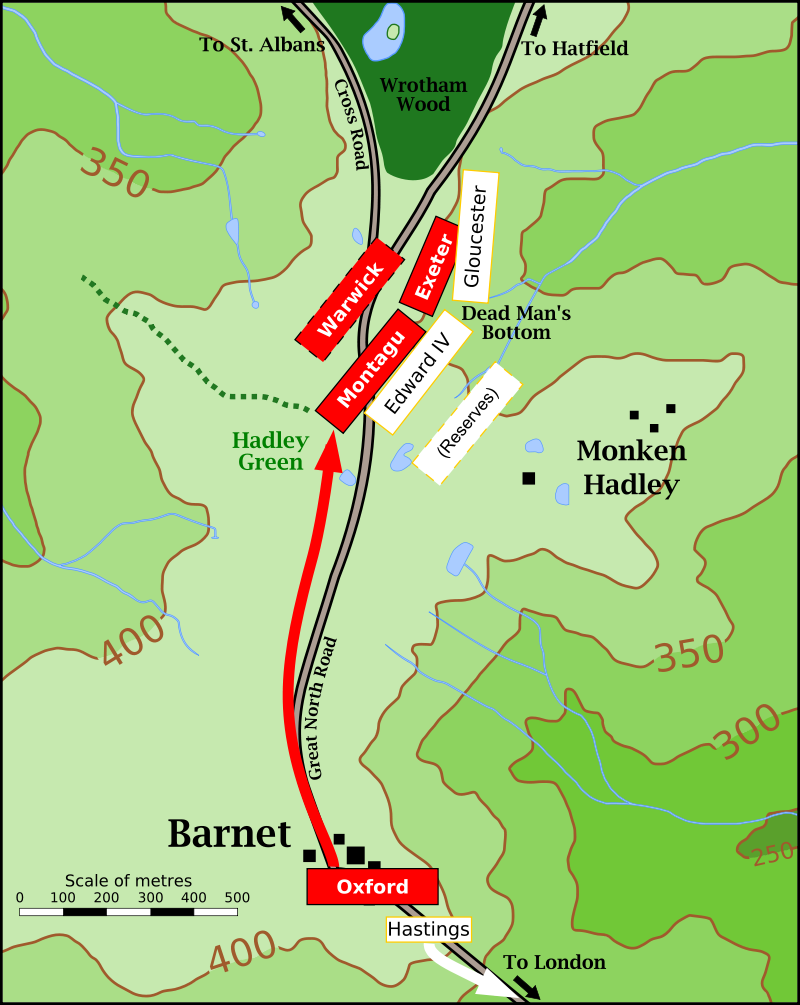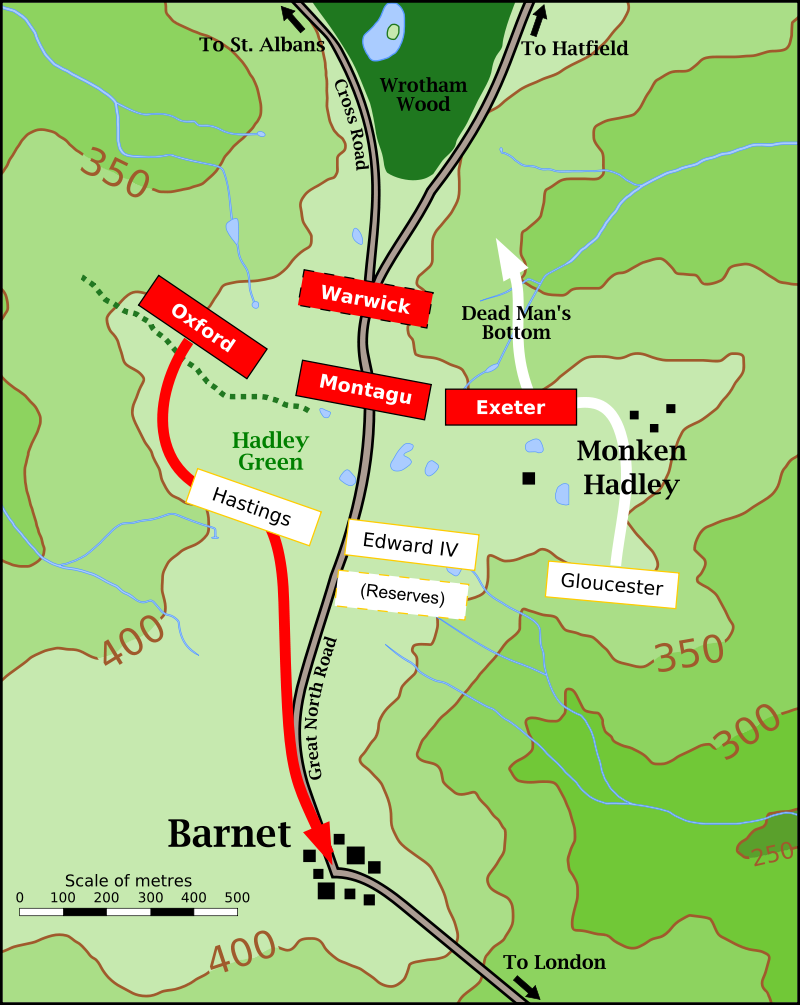 Известие о столь неожиданном финале, как я понял, взбудоражила спонсора всего мероприятия – короля Людовика XI ("во, балбесы!" - вероятно вскричал он в гневе "сколько денег впустую!!!!"), и потребовал от Уорика решительных действий. Ричард Невилл, вздохнув, пошел отрабатывать деньги французов. 13 апреля 1471 года армия йоркистов, прихватив с собой вновь плененного «гражданина» Генриха, выступила ему навстречу.