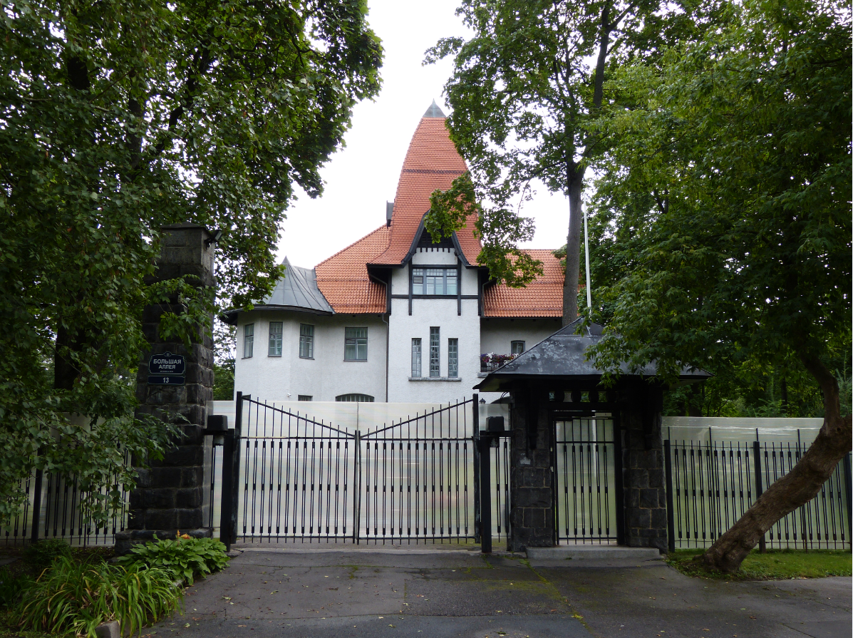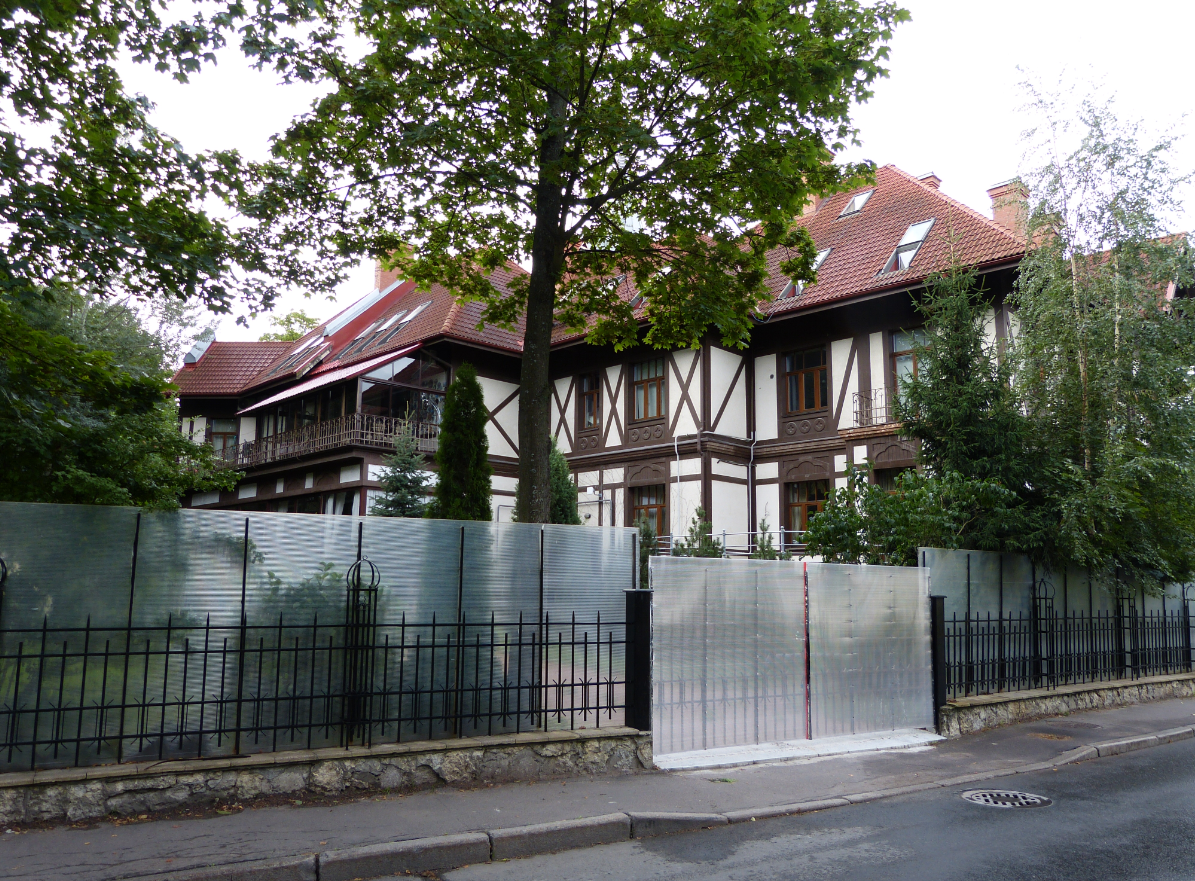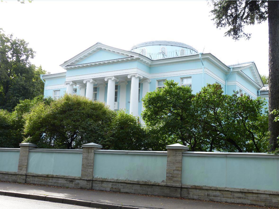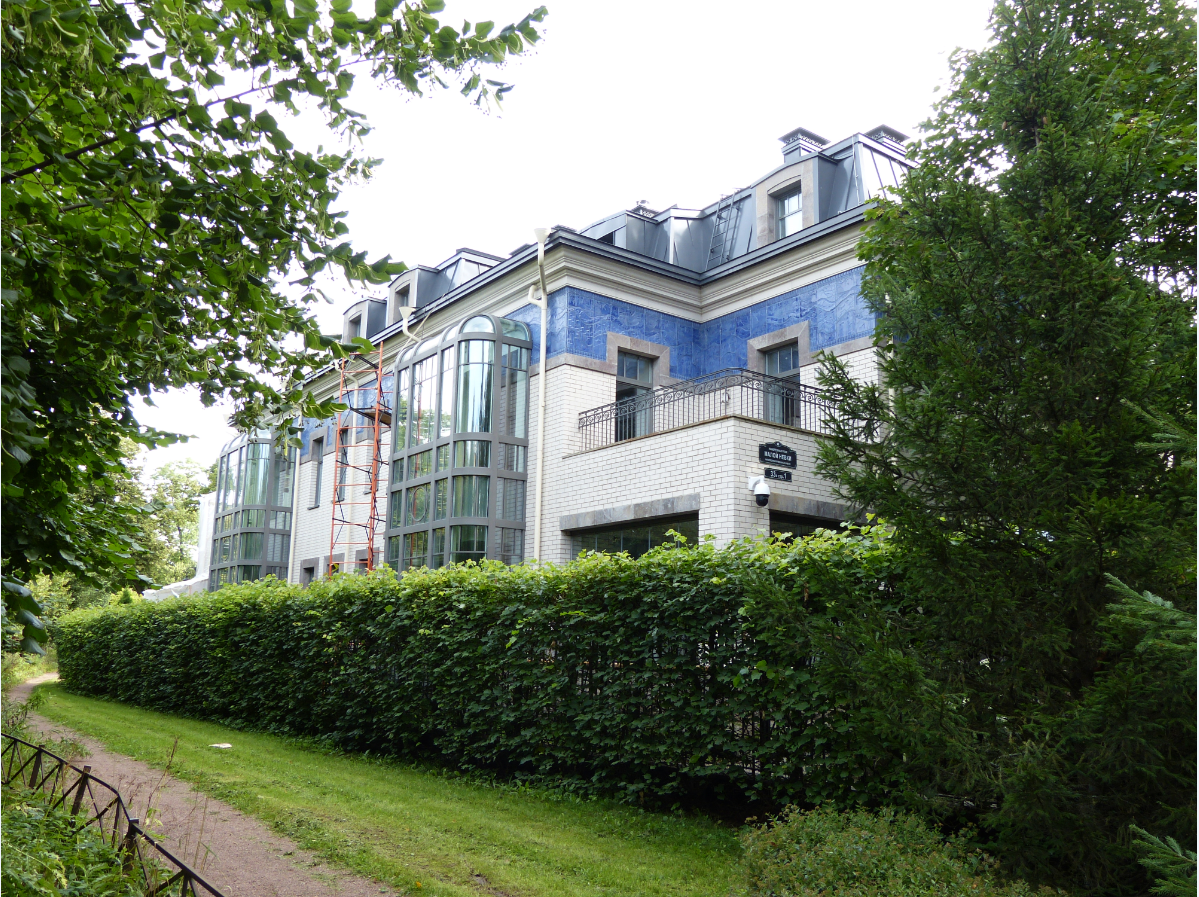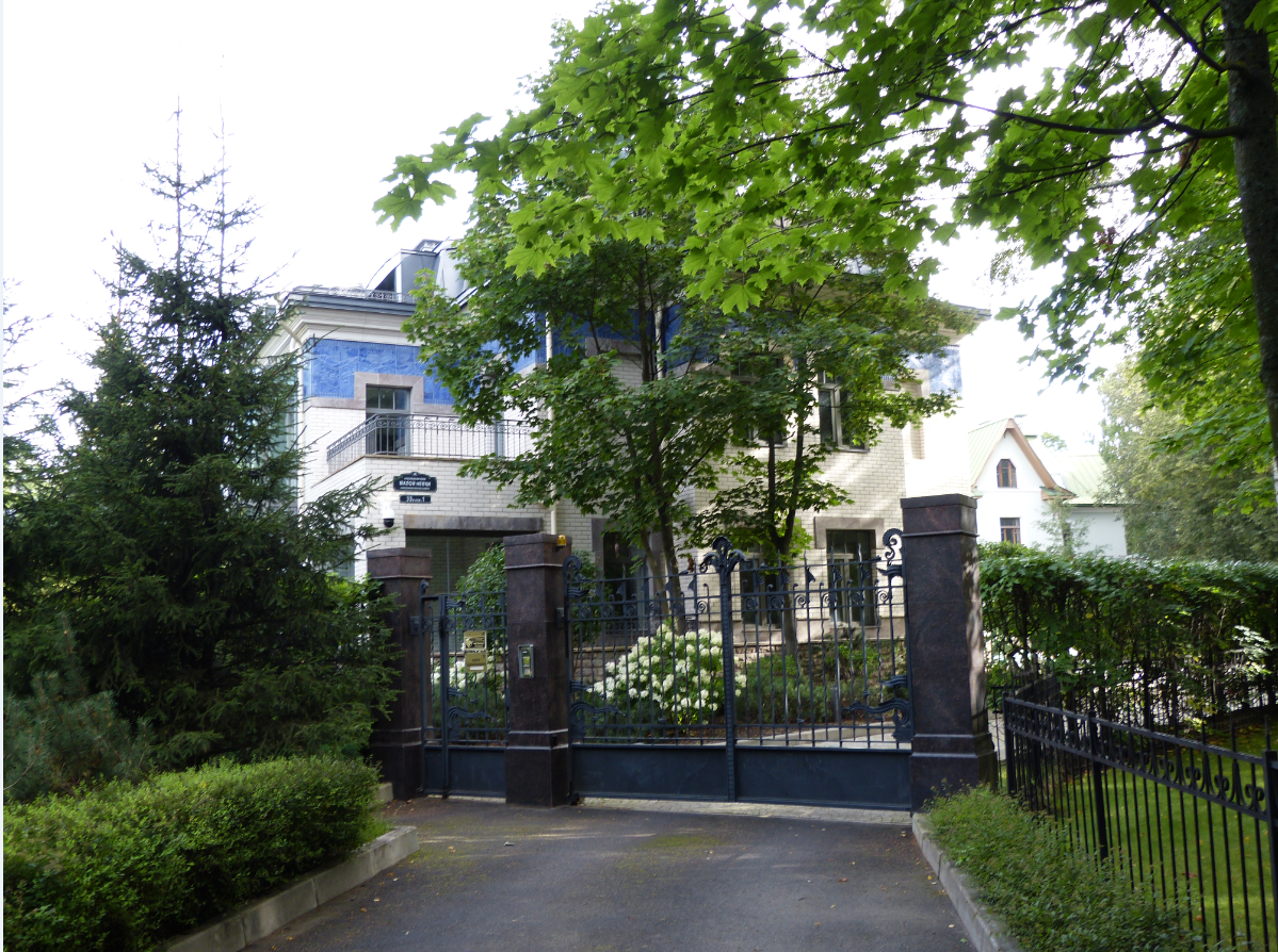 Это замечательное здание использовалось при съёмках фильма "Приключения принца Флоризеля". Но его нынешние владельцы сделали всё, чтобы увидеть полностью особняк не мог никто кроме тех, кому разрешено пройти через ворота. На мой взгляд, это жлобство.