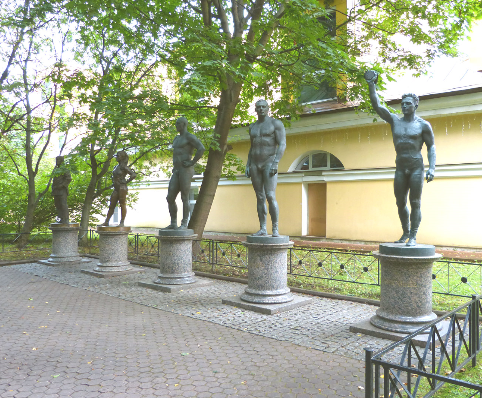 Я сначала даже не понял, кому они поставлены. Но всё оказалось просто: за спинами бронзовых атлетов находится Комплексная школа высшего спортивного мастерства. А высокой чести стоять на Каменном острове удостоились Тагир Хайбулаев, Наталья Воробьёва, Александр Карелин, Анатолий Рощин и Николай Соловьёв. Все они атлеты, борцы и олимпийские чемпионы.